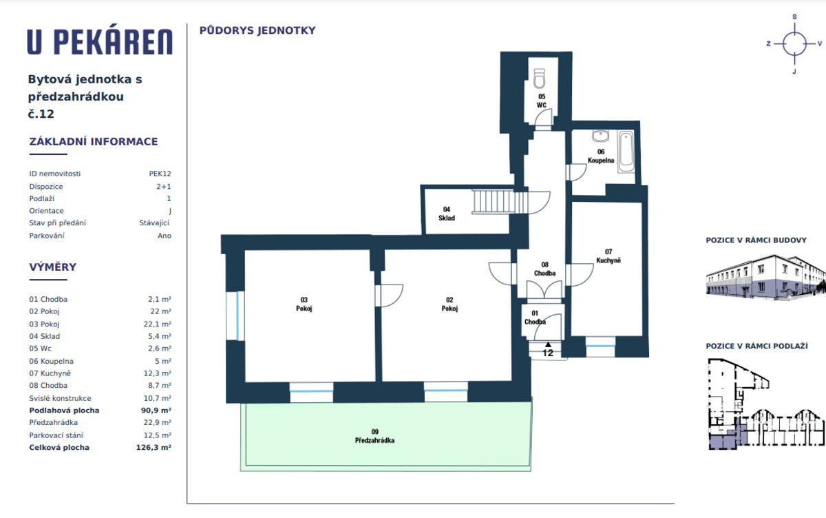 Bytová jednotka č. 12 s dispozicí 2+1, 90,9 m2 k bytu náleží předzahrádka 22,9 m2 a parkovací stání 12,5 m2. Celková plocha jednotky 126,30 m2 se nachází v 1. podlaží.