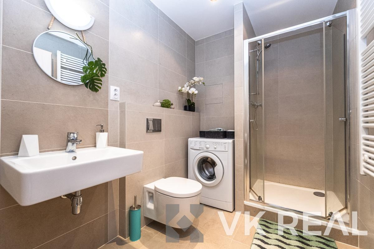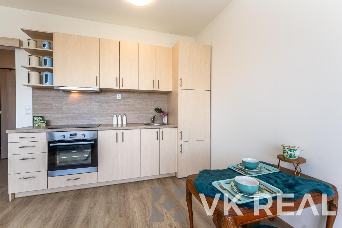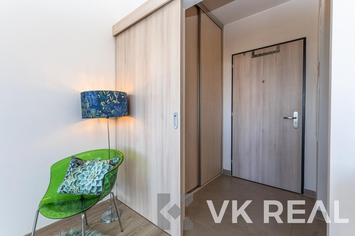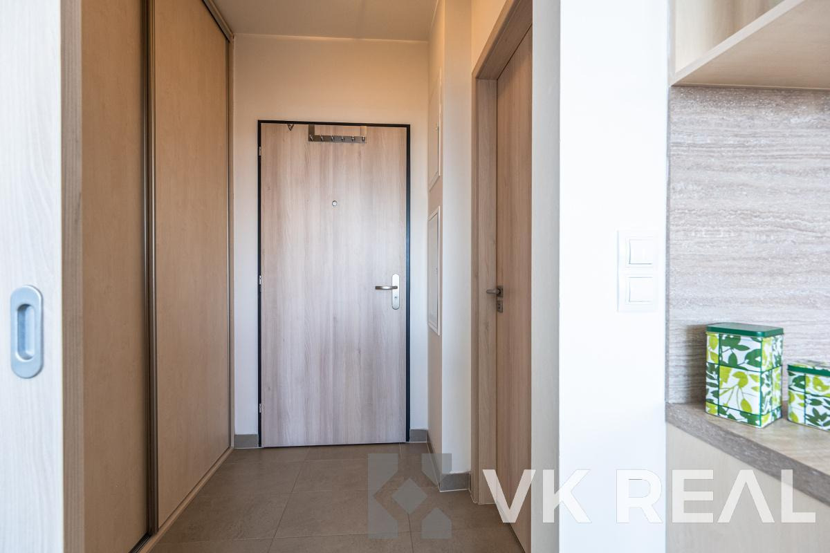 Dispozice bytu nabízí promyšlené využití prostoru - součástí je plně vybavená kuchyňská linka s vestavěnými spotřebiči (lednice, trouba, indukční deska, digestoř), v koupelně pračka a v předsíni praktická vestavěná skříň.