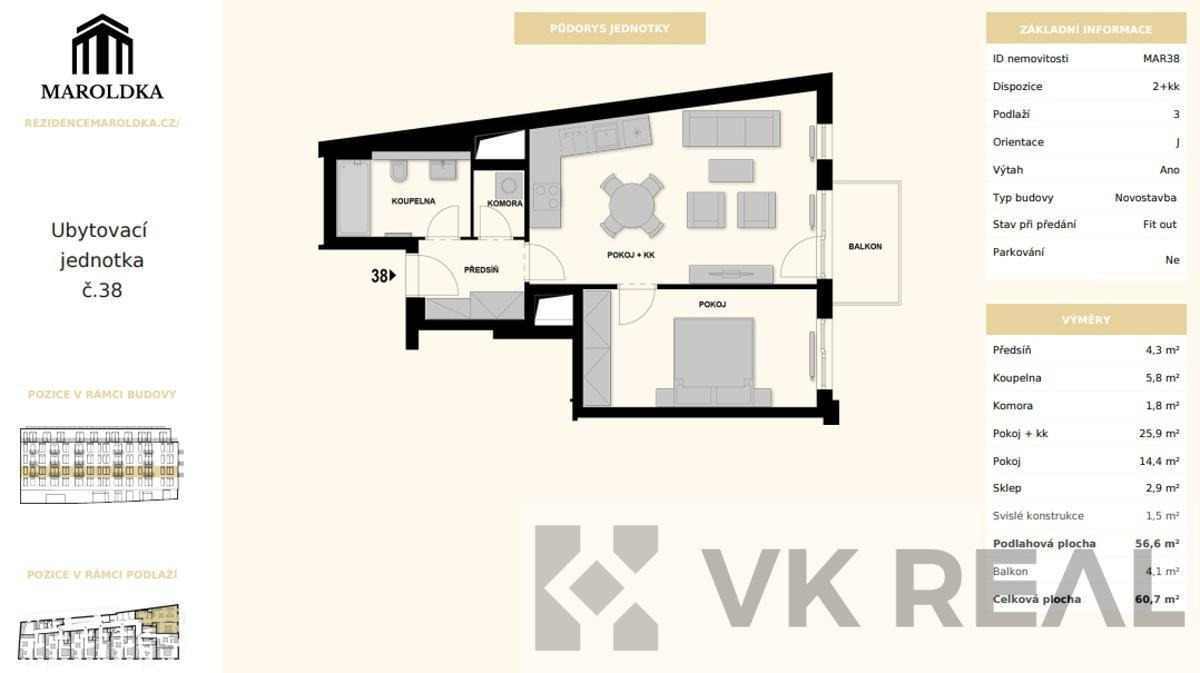 Byt o podlahové ploše 56,6 m ve 3. podlaží nabízí velkorysý obývací pokoj s přípravou na kuchyňský kout, ložnici, prostornou vstupní chodbu, praktickou komoru a koupelnu stoaletou. K bytu náleží také balkon a sklepní kóje. Provedení fit out zahrnuje hotovou koupelnu, podlahy, interiérové dveře a kompletní rozvody stačí jen doladit interiér podle vlastního vkusu.