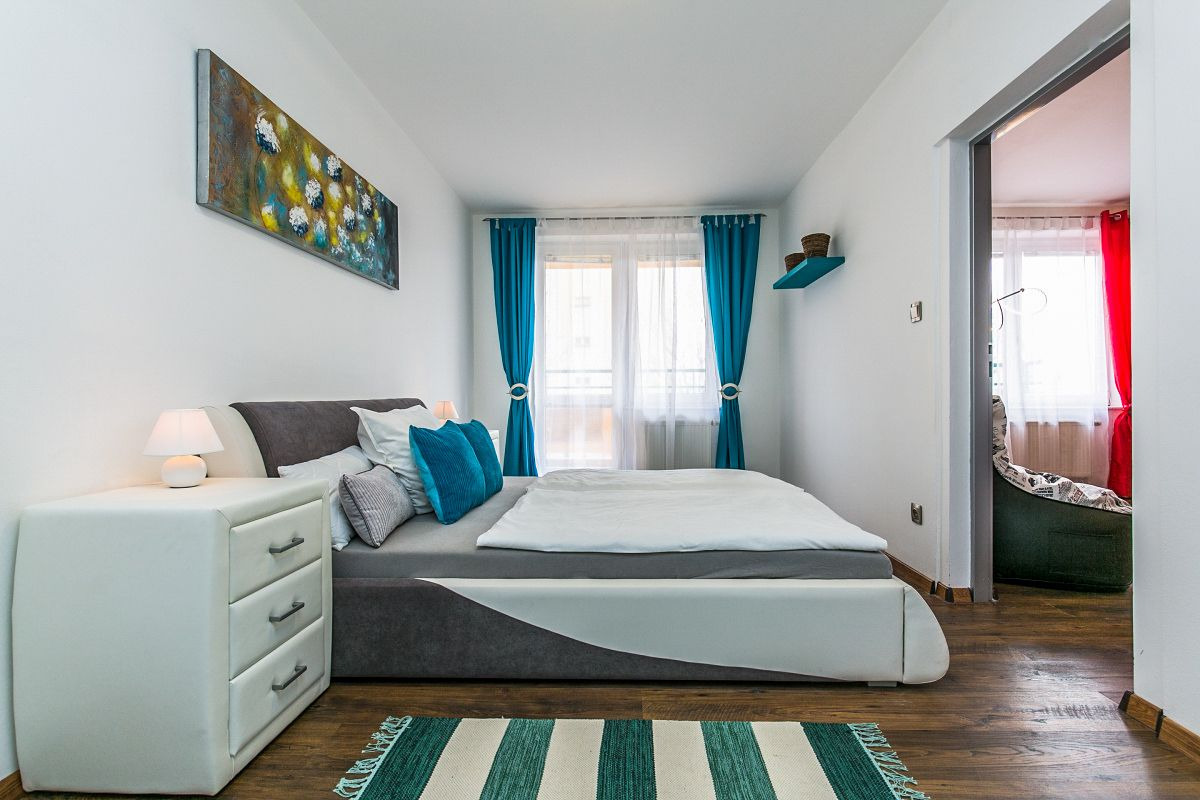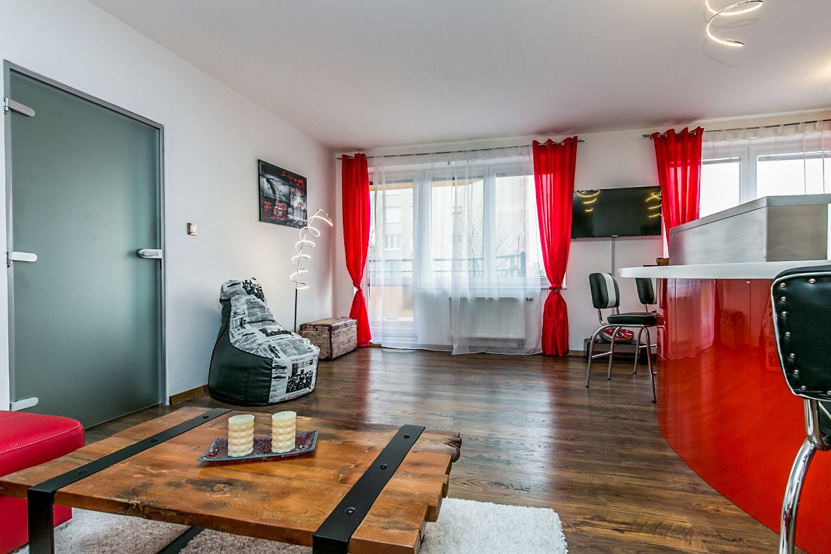 Dispozice sestává z předsíně, ze které se vchází do obývacího prostoru propojeného s kuchyní. Z obývacího pokoje vedou skleněné dveře do ložnice. Přístup na lodžii je jak z obývacího pokoje, tak z ložnice. Skleněné posuvné dveře do koupelny i šatny.