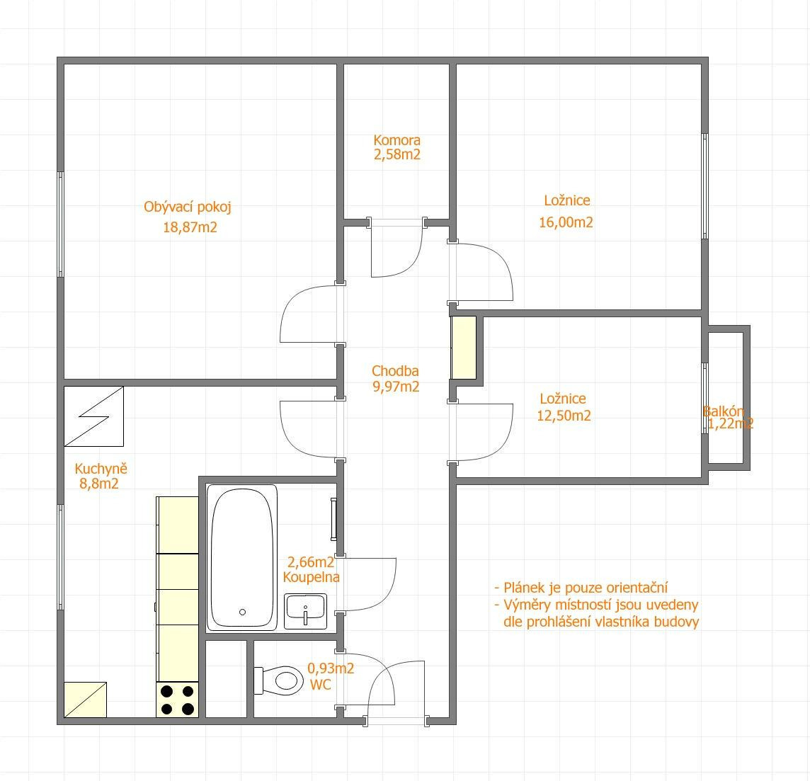 Jednotka disponuje třemi pokoji - každý se samostatným vstupem z předsíně, kuchyni s kuchyňskou linkou včetně spotřebičů (kromě myčky), koupelnu s vanou, samostatné WC a praktickou komoru.
