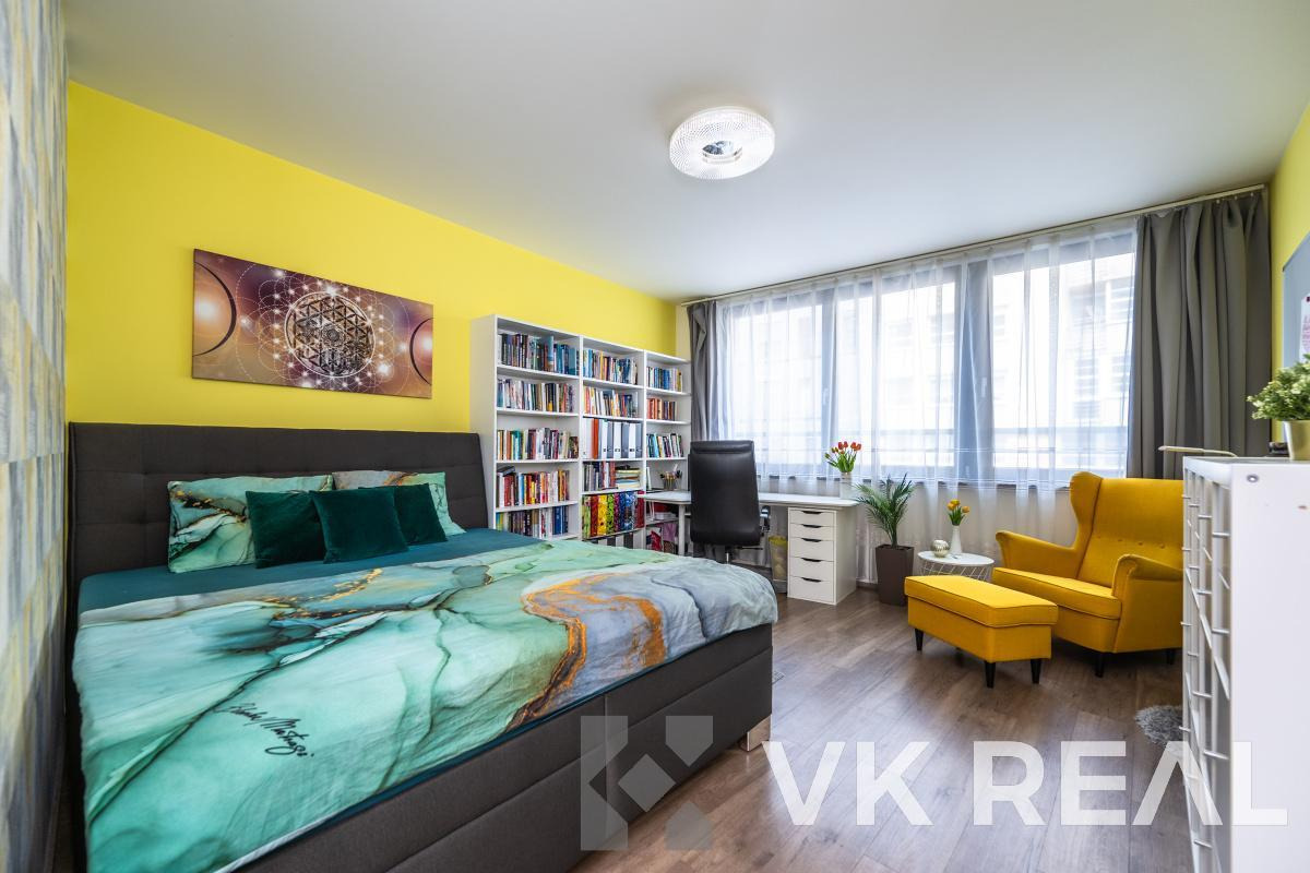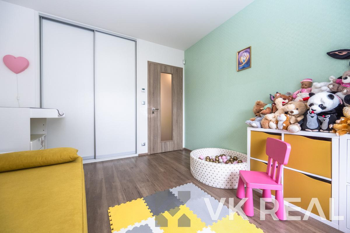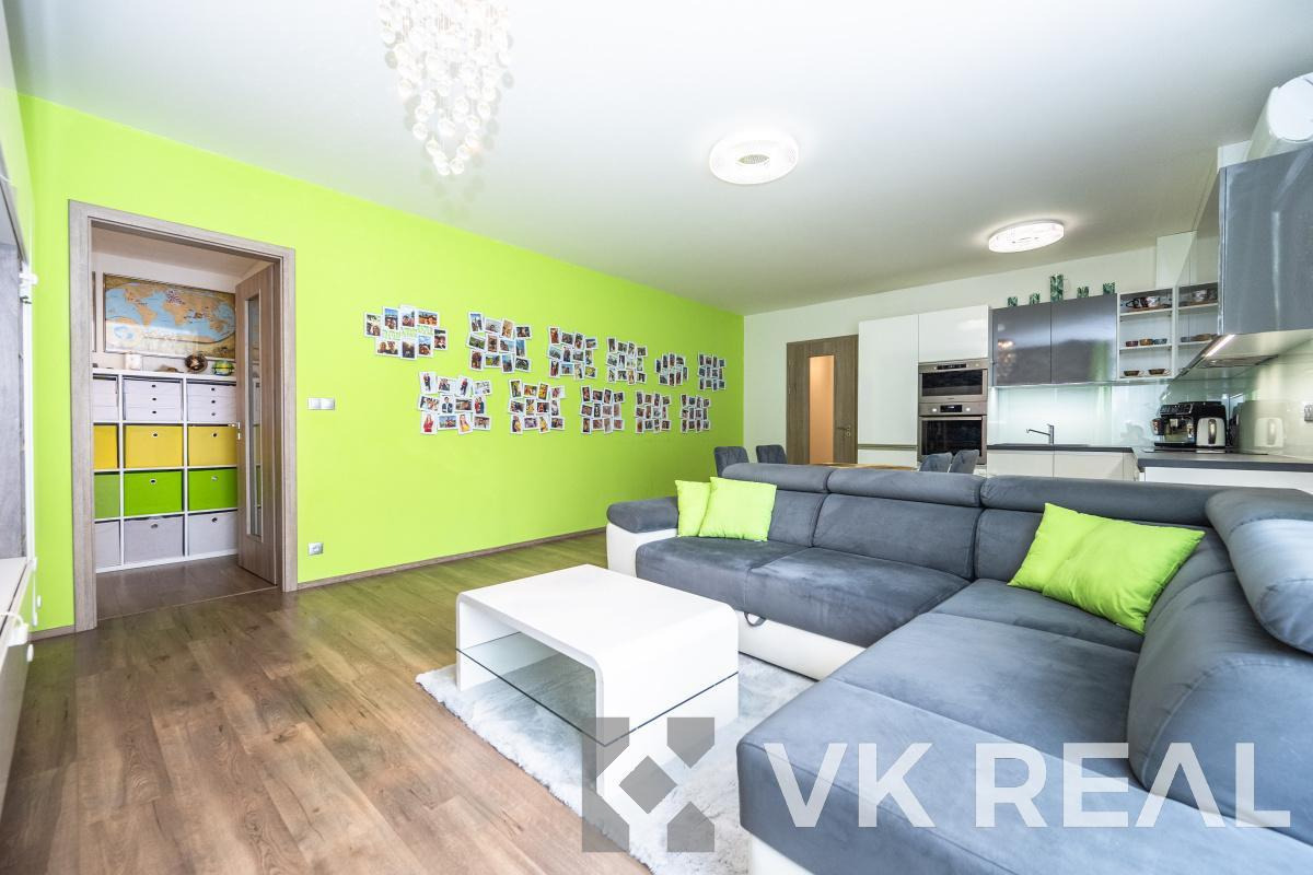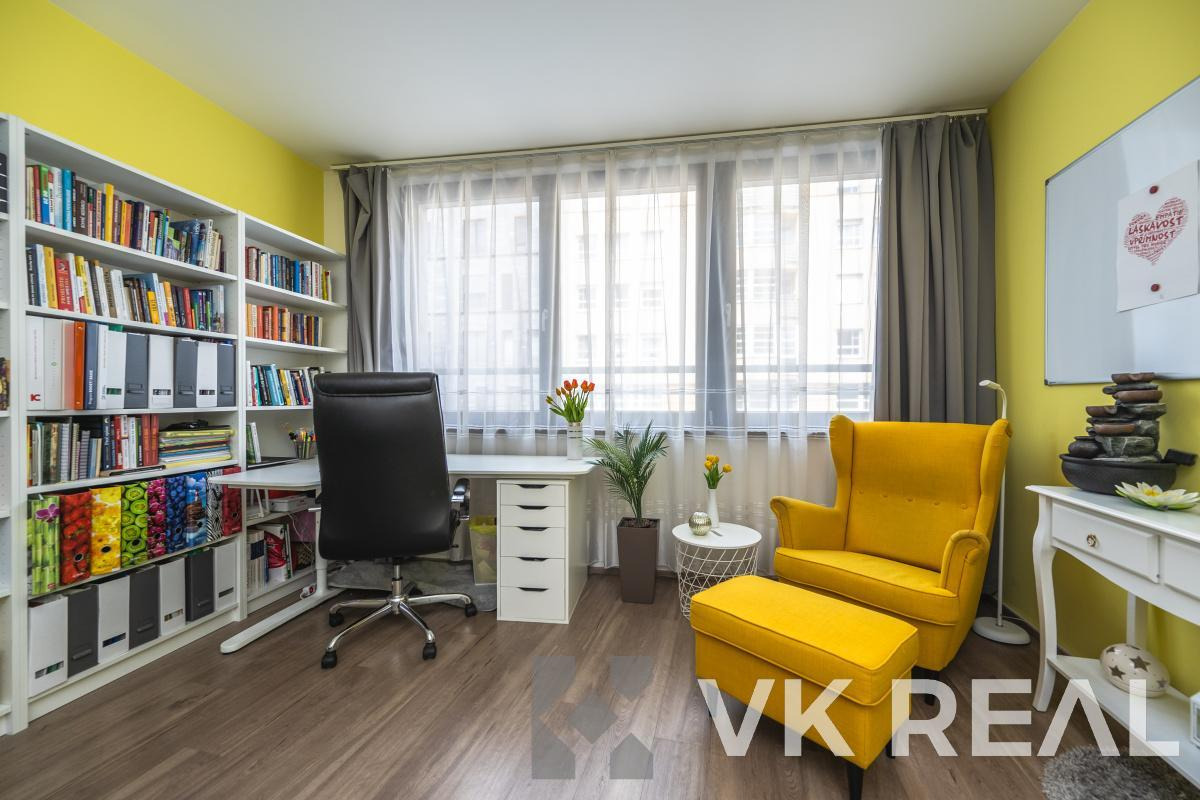 Jeho praktická dispozice zahrnuje vstupní předsíň, šatnu, denní WC, prostorný obývací pokoj s kuchyní, dětský pokoj a ložnici, koupelnu s vanou a WC, pracovnu a lodžii. Lodžie je přístupná z obývacího a dětského pokoje a je orientována jihozápadním směrem do klidného vnitrobloku plného zeleně.