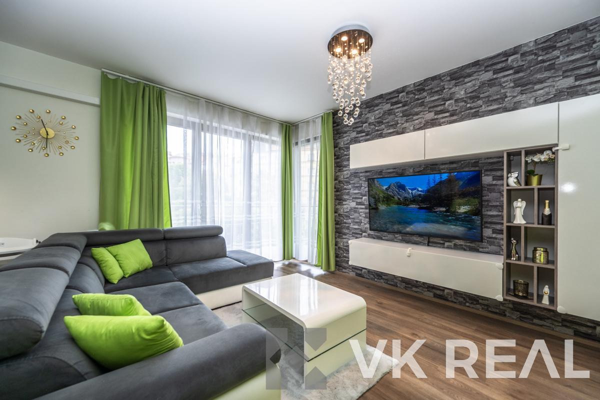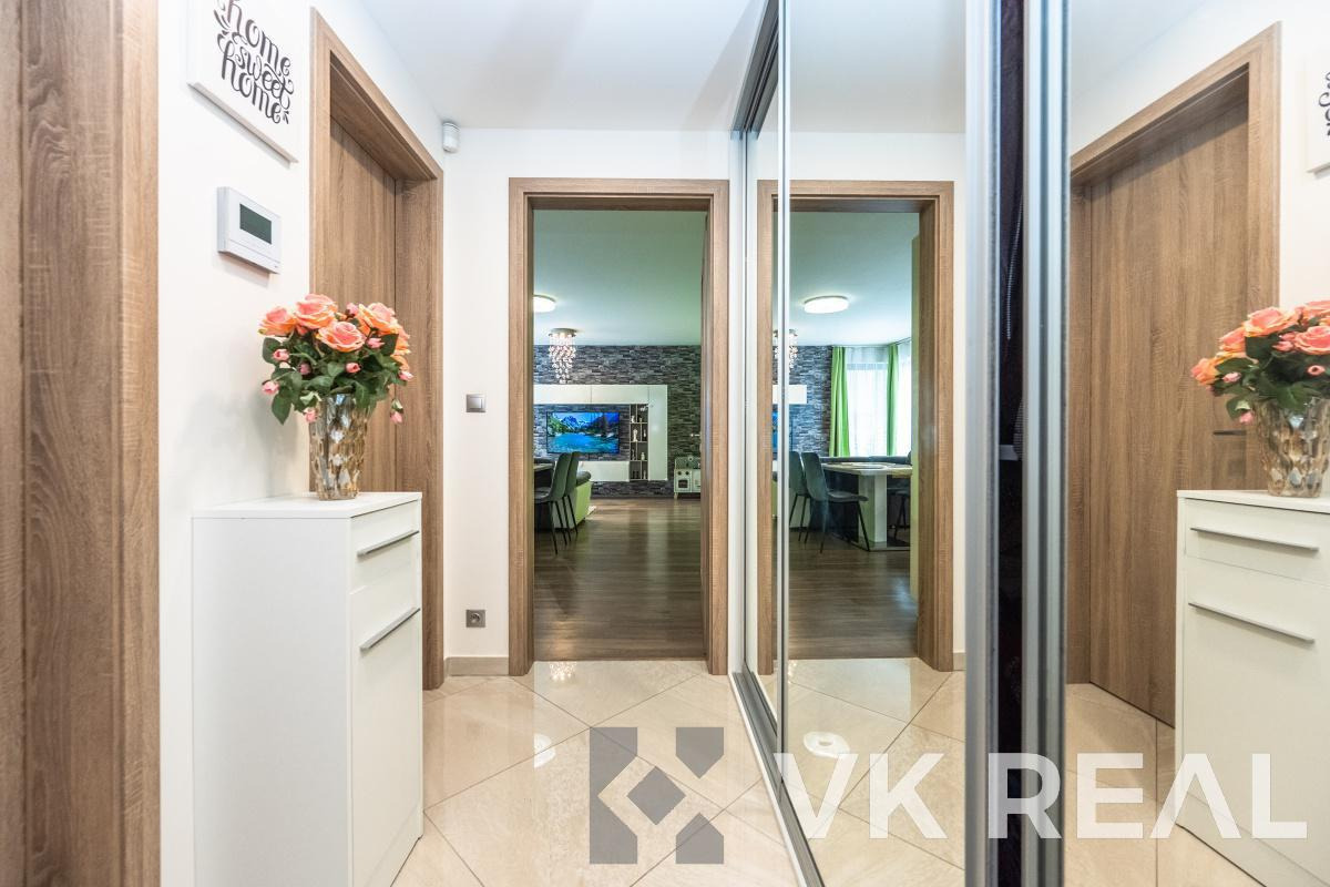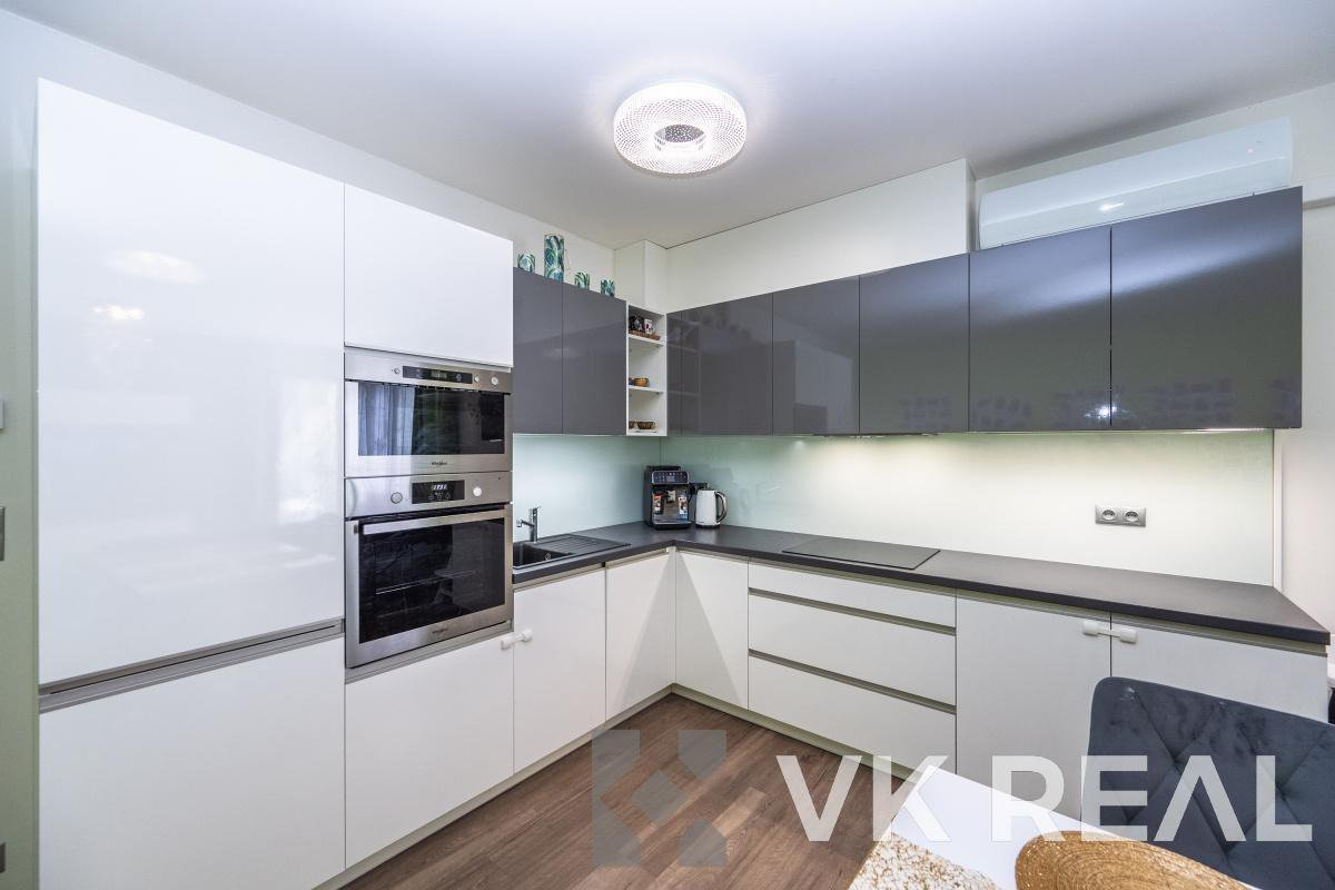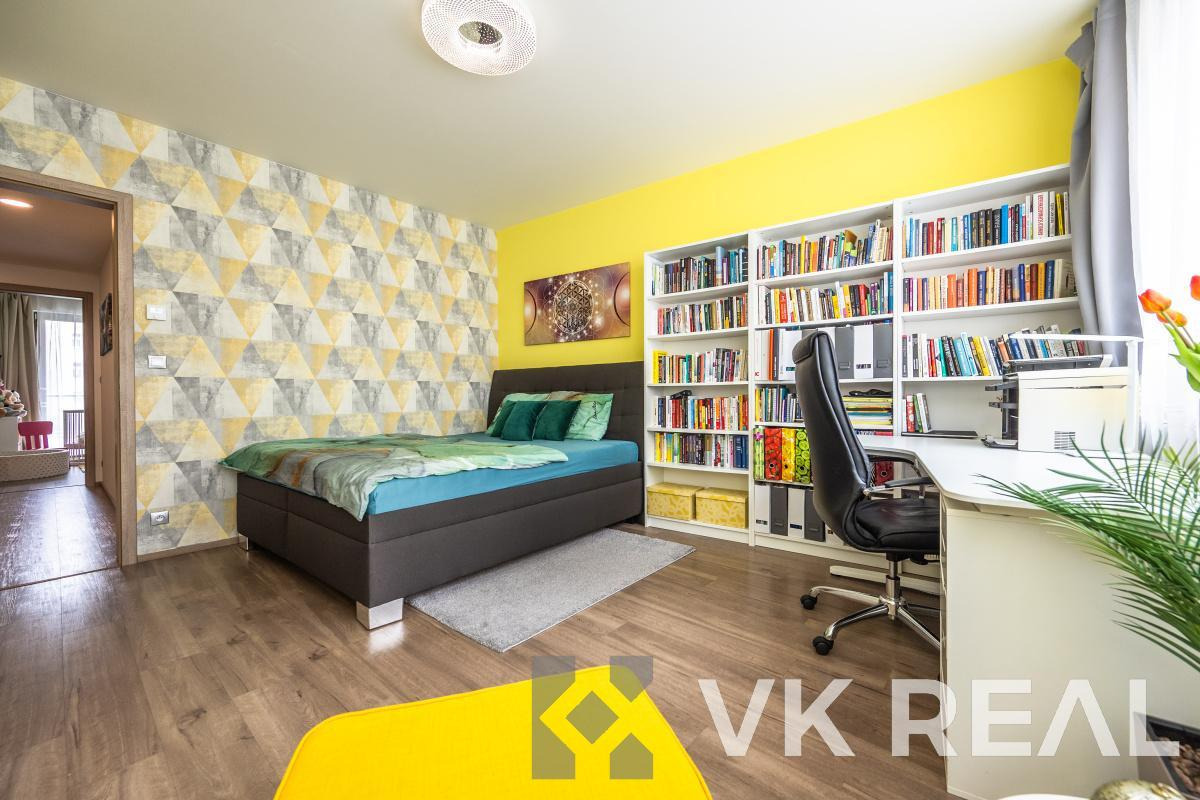 Jeho praktická dispozice zahrnuje vstupní předsíň, šatnu, denní WC, prostorný obývací pokoj s kuchyní, dětský pokoj a ložnici, koupelnu s vanou a WC, pracovnu a lodžii. Lodžie je přístupná z obývacího a dětského pokoje a je orientována jihozápadním směrem do klidného vnitrobloku plného zeleně.