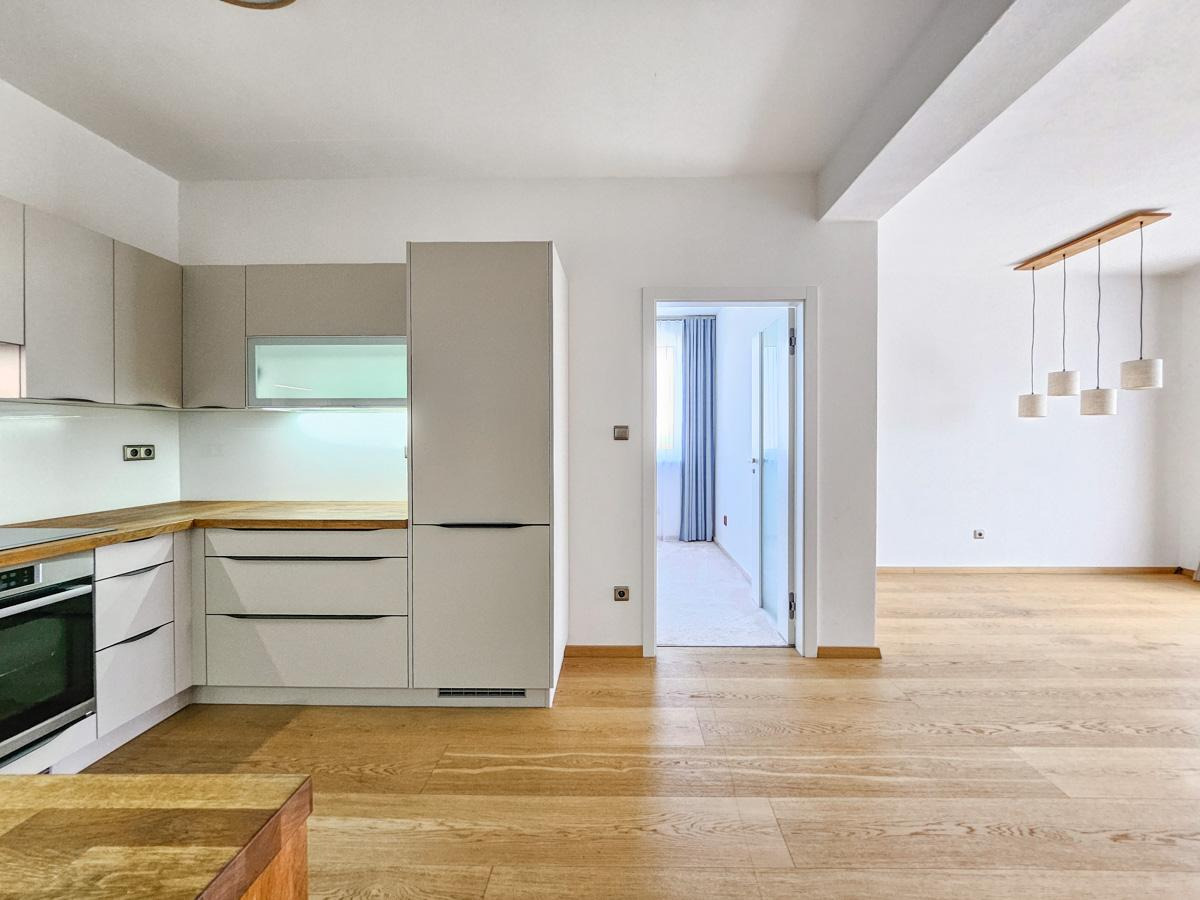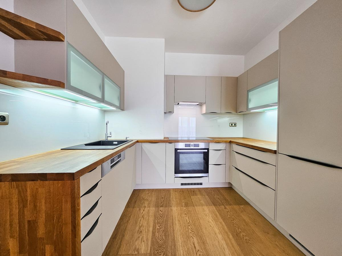 Okna jsou vybavena venkovními žaluziemi. V bytě je vestavěná kuchyňská linka na míru se všemi spotřebiči.