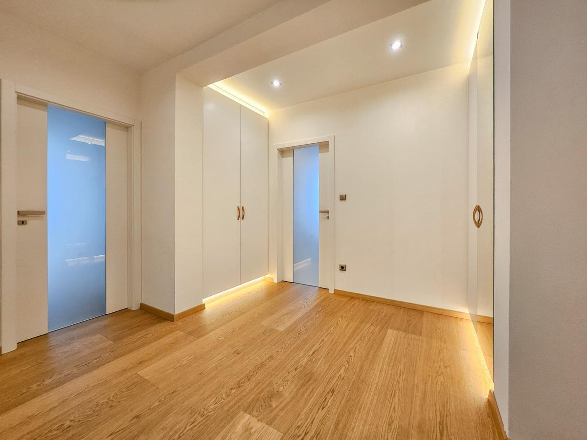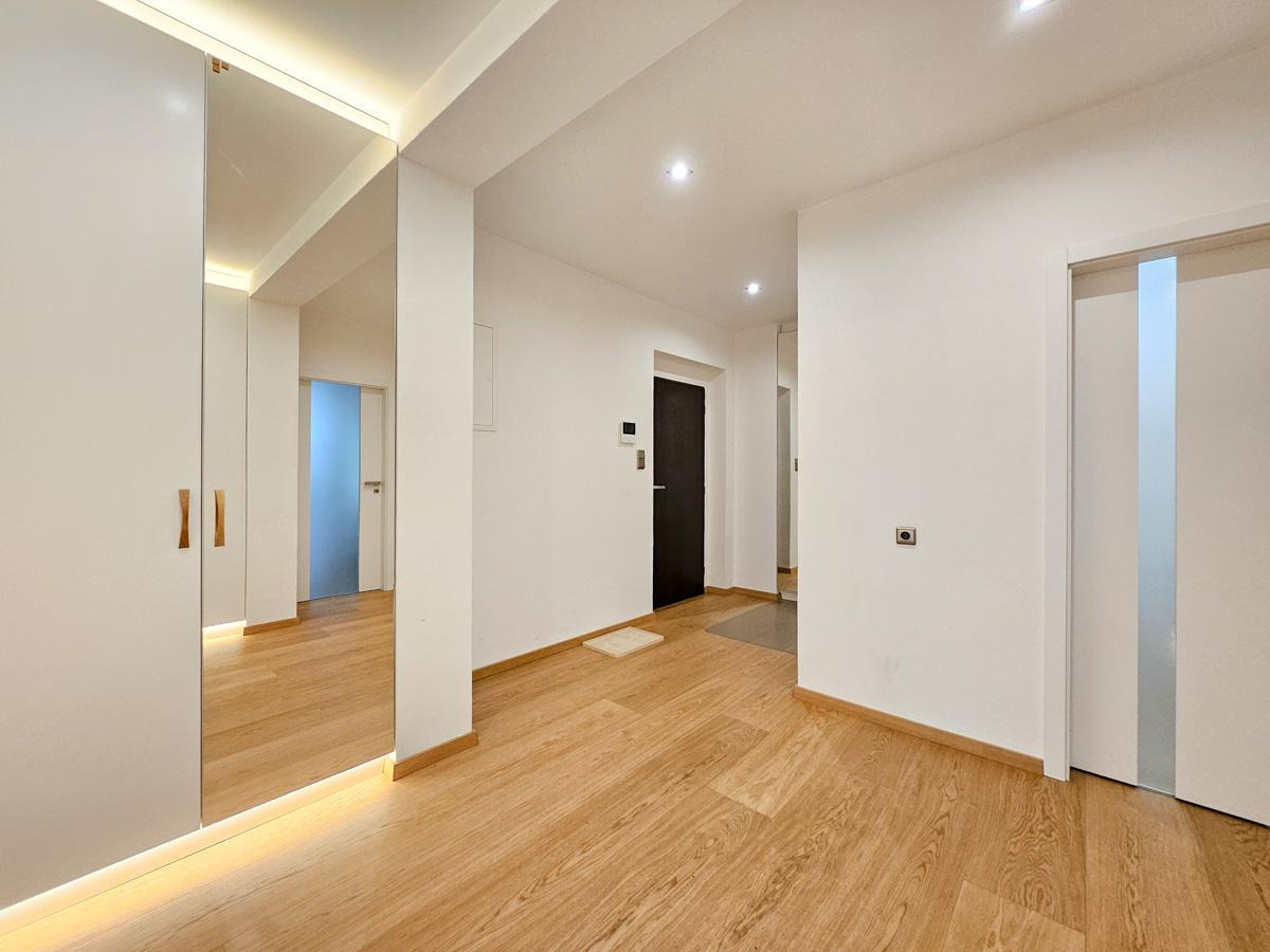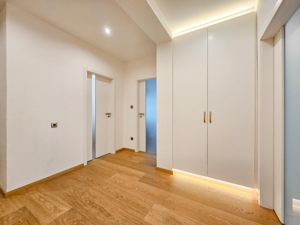 Jeho dispozici tvoří prostorná předsíň s vestavěnými skříněmi, obývací pokoj s kuchyňským koutem a vstupem na terasu orientovanou na severovýchod, dvě samostatné ložnice, koupelna se sprchovým koutem a s WC. Celková plocha bytu vč. terasy zaujímá cca 90m2. K bytu dále náleží velký sklep o celkové ploše cca 7m2. Byt je nezařízený, pouze vestavěný nábytek dle fotografií. V obytných místnostech je položena kvalitní dřevěná podlaha a v ložnicích koberce, v koupelně a na terasách kvalitní dlažba.