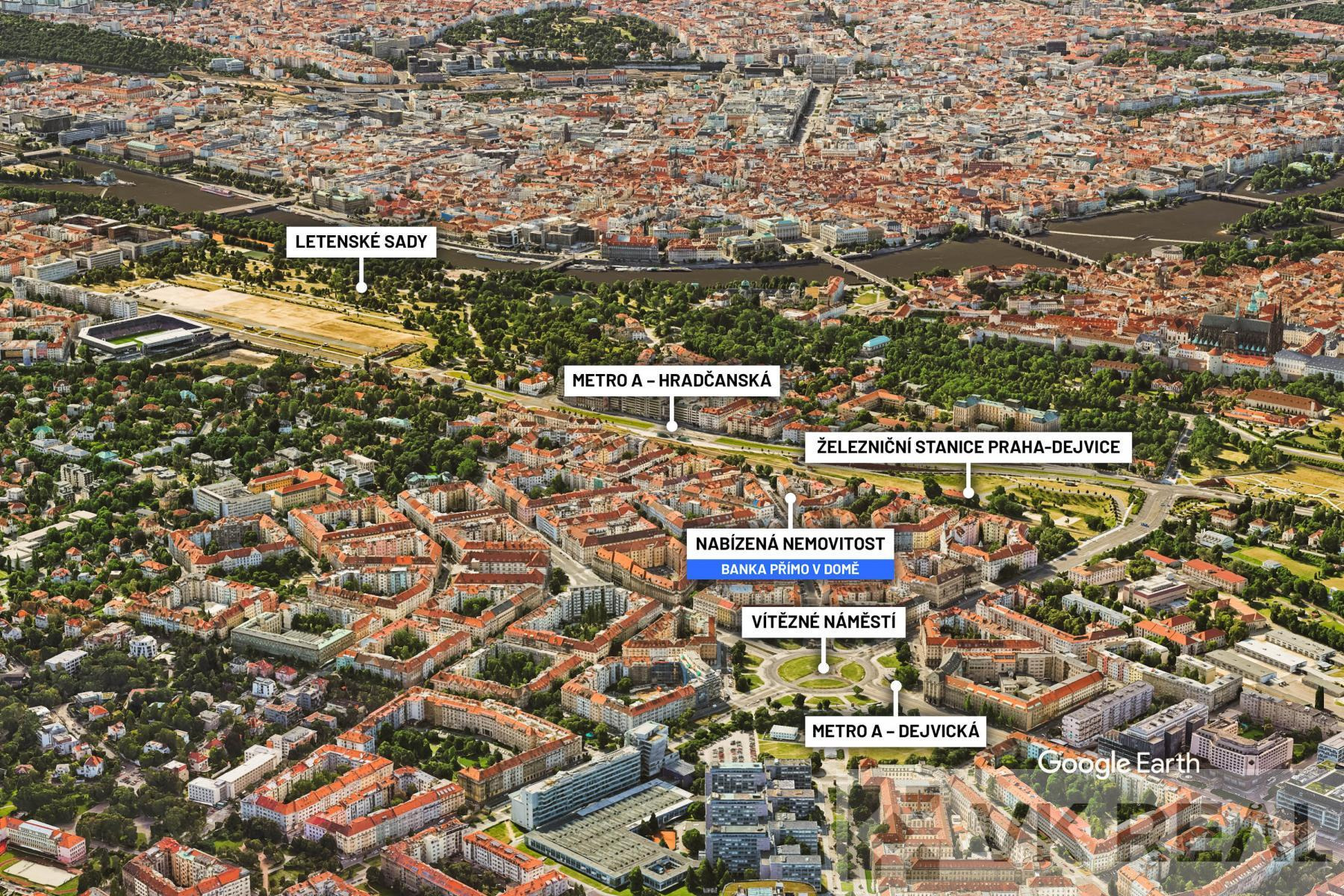 Poloha bytu je výborná v srdci Dejvic, poblíž Vítězného náměstí, s veškerou občanskou vybaveností, obchody, restauracemi a skvělou dopravní dostupností: tramvaje, metro, železnice, tunel Blanka a blízko letiště. V okolí je také park Stromovka a je vidět i na Pražský hrad.