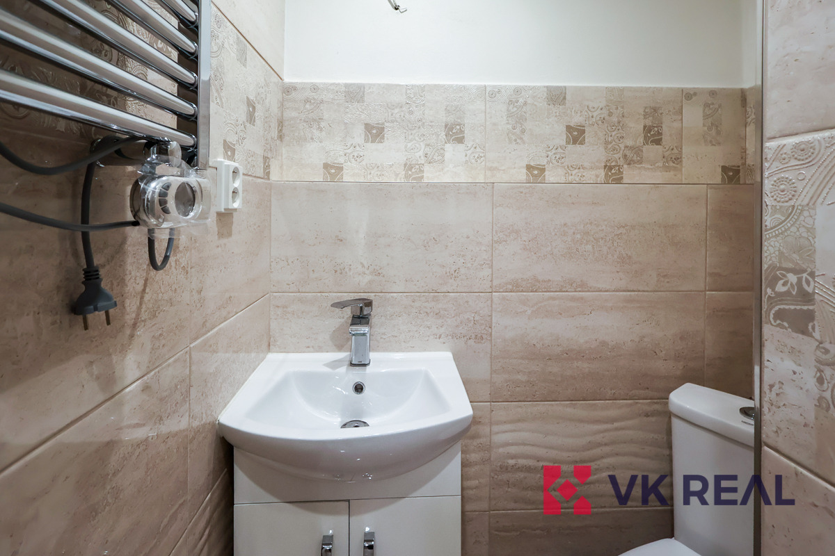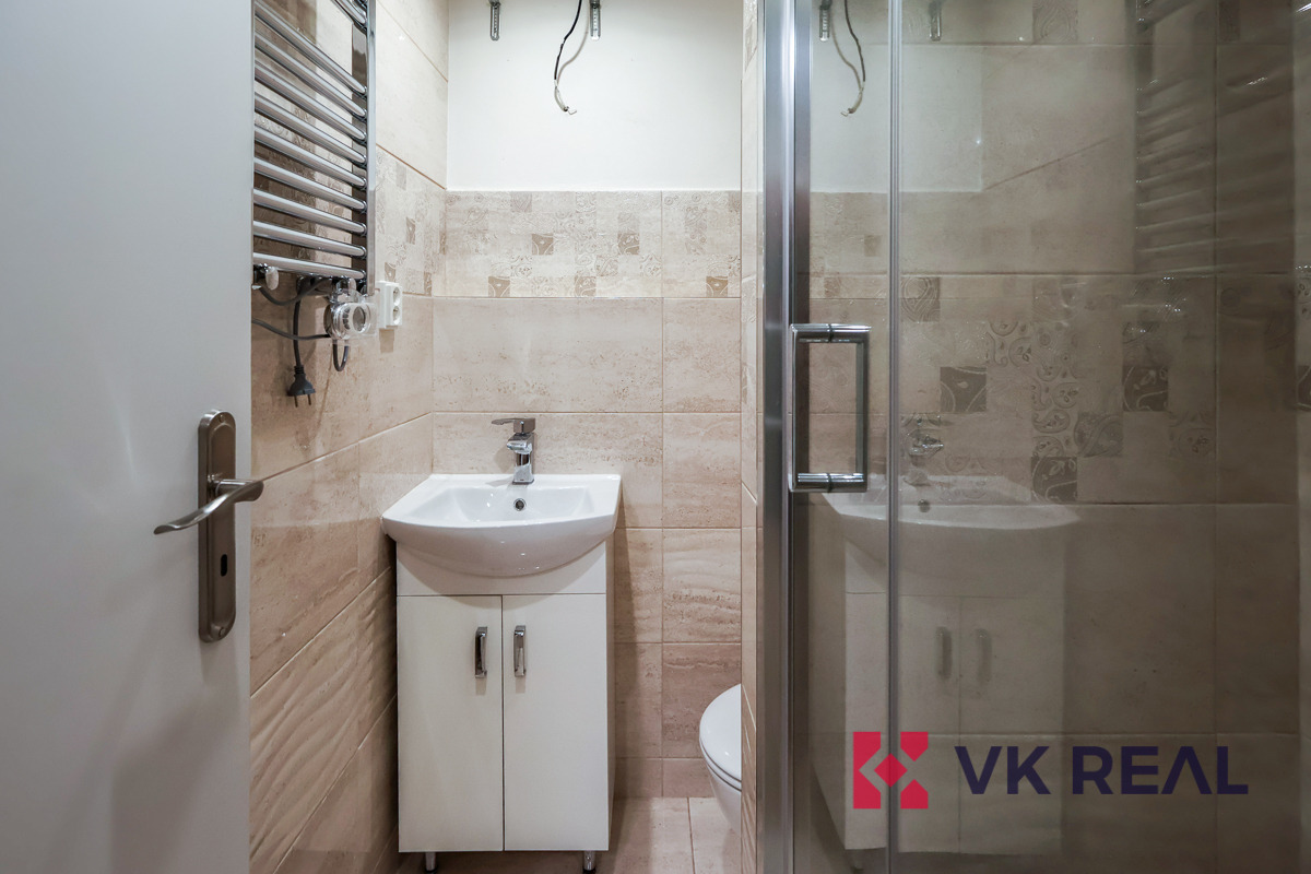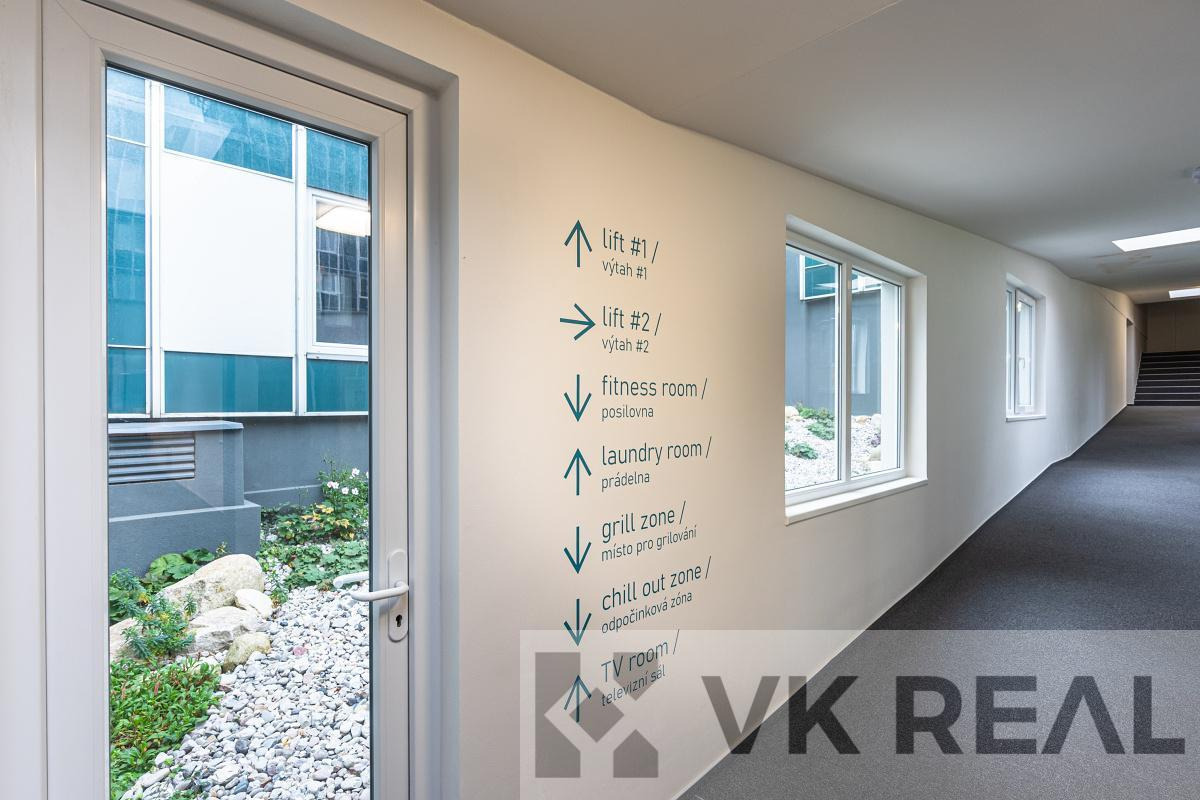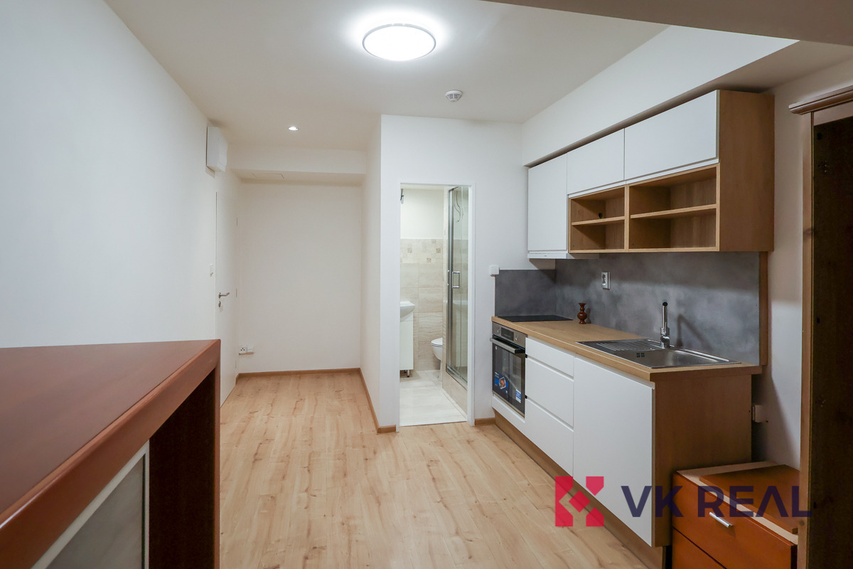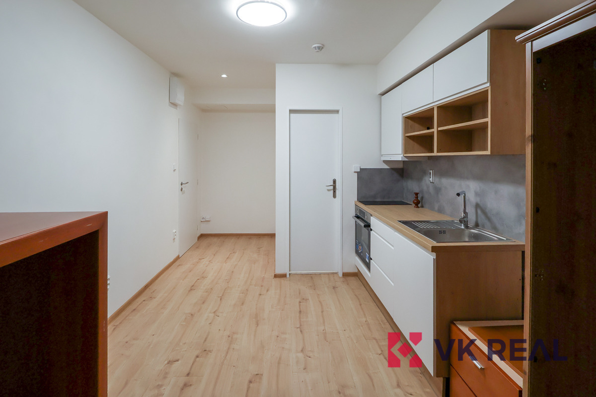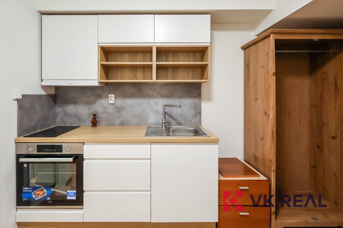 Prostor disponuje jednou hlavní místností s kuchyňskou linkou (indukční dvouvařič, elektrická trouba, odsavač s recirkulací, vyobrazené skříně nejsou součástí prodeje), dále je zde vstup do koupelny se sprchovým koutem a WC. Na podlaze je položená plovoucí podlaha, koupelna a WC dlažba. Vše je nové, v podstatě nepoužité.