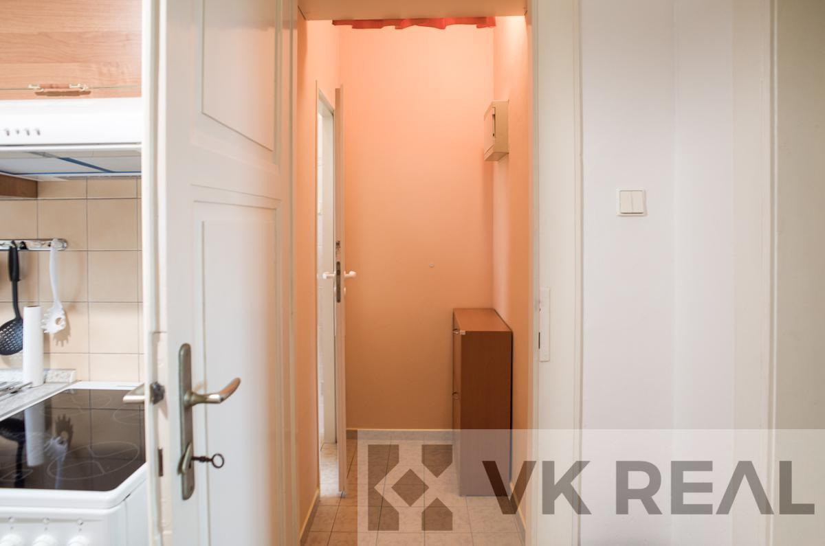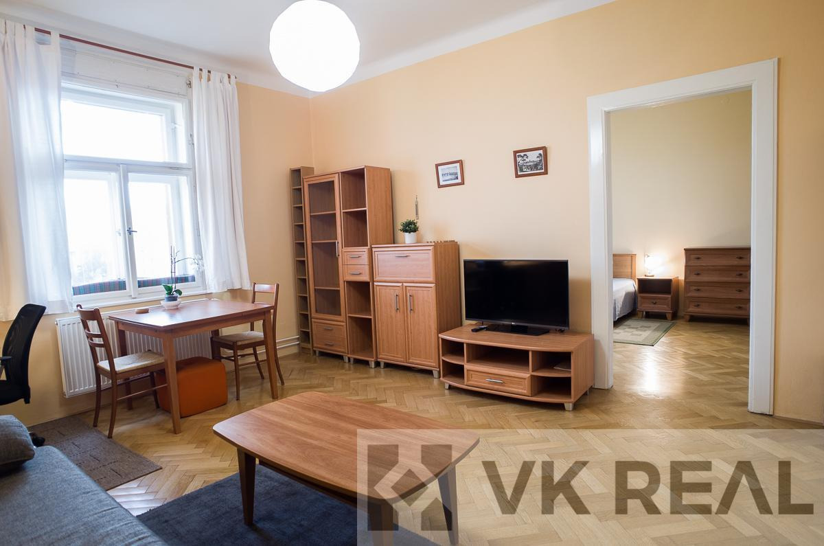 Dispozici bytu tvoří obývací pokoj, ložnice, plně vybavená kuchyně, koupelna s vanou a chodbička. Byt je kompletně zařízen (viz fotografie), podlahy pokrývají původní dubové parkety a okna jsou opatřena dvojitými skly s dřevěnými roletami.