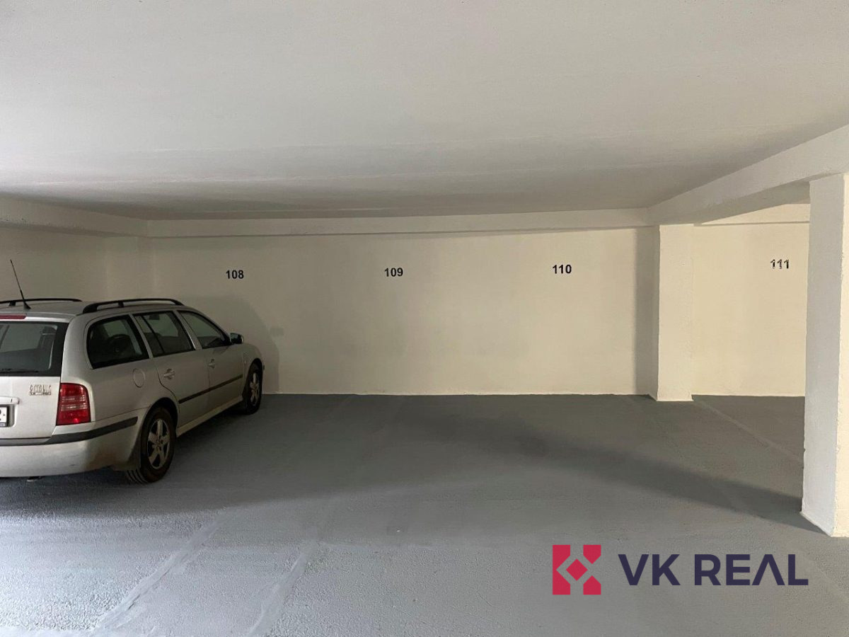 Garážová vrata jsou na dálkové ovládání. Šířka stání 2,3m. Vejde se i menší SUV. Rekonstrukce z roku 2022 (nová podlaha, LED osvětlení, výmalba).