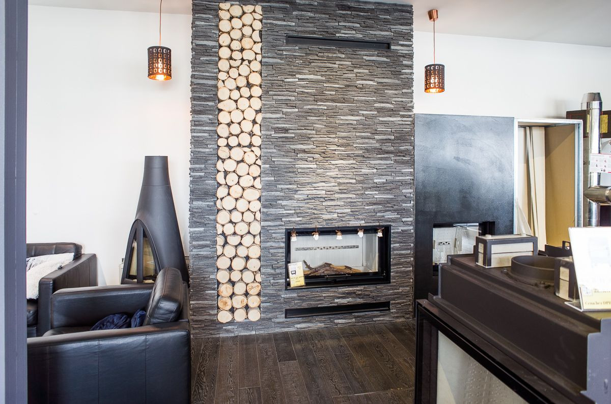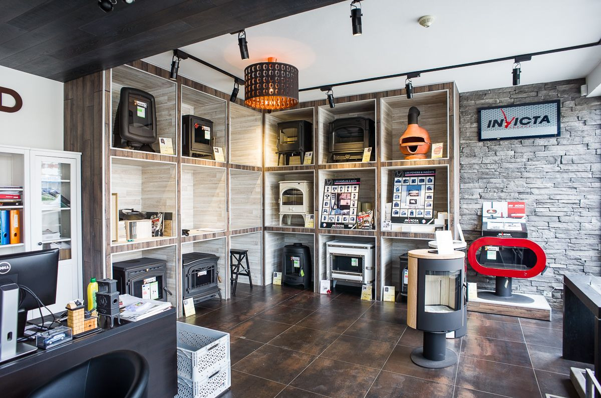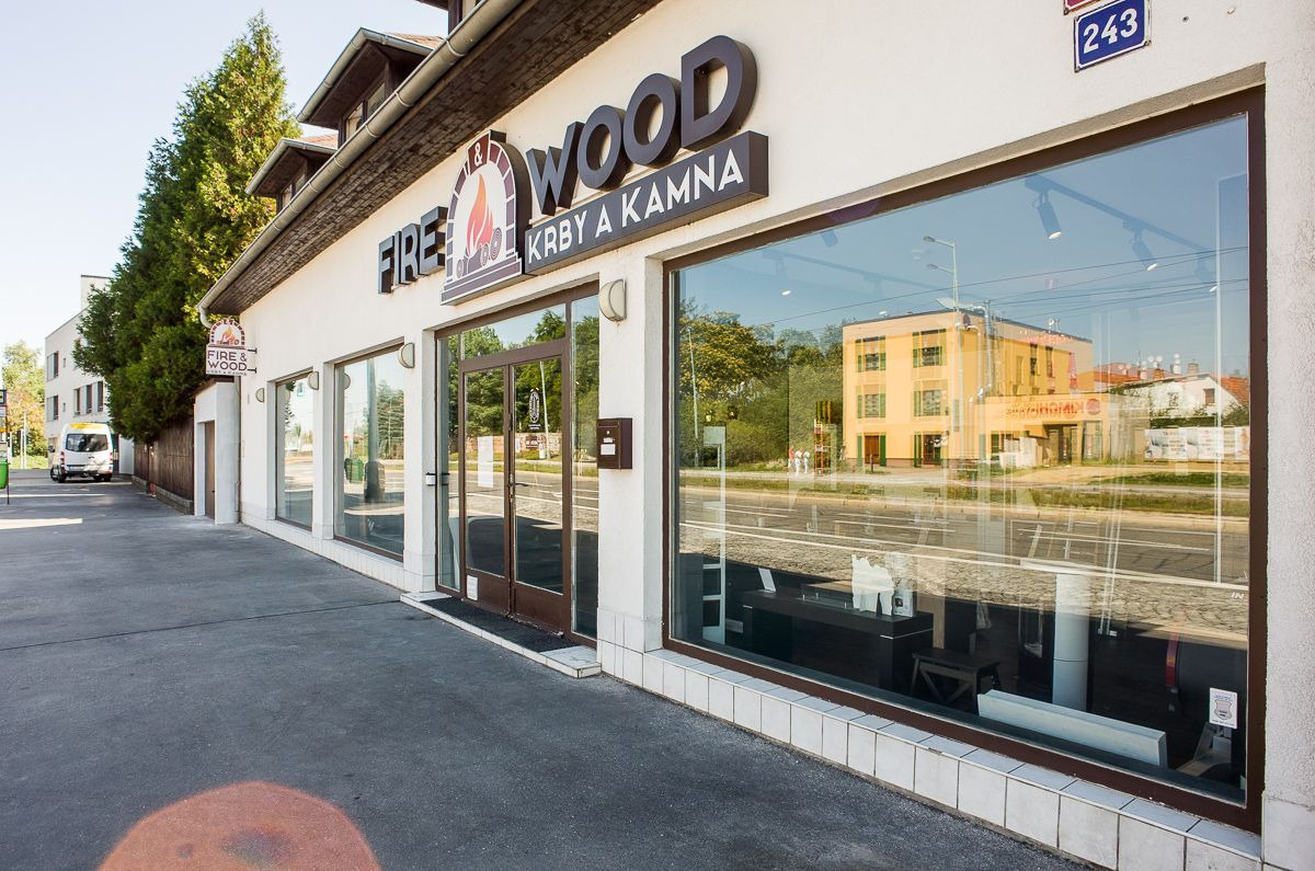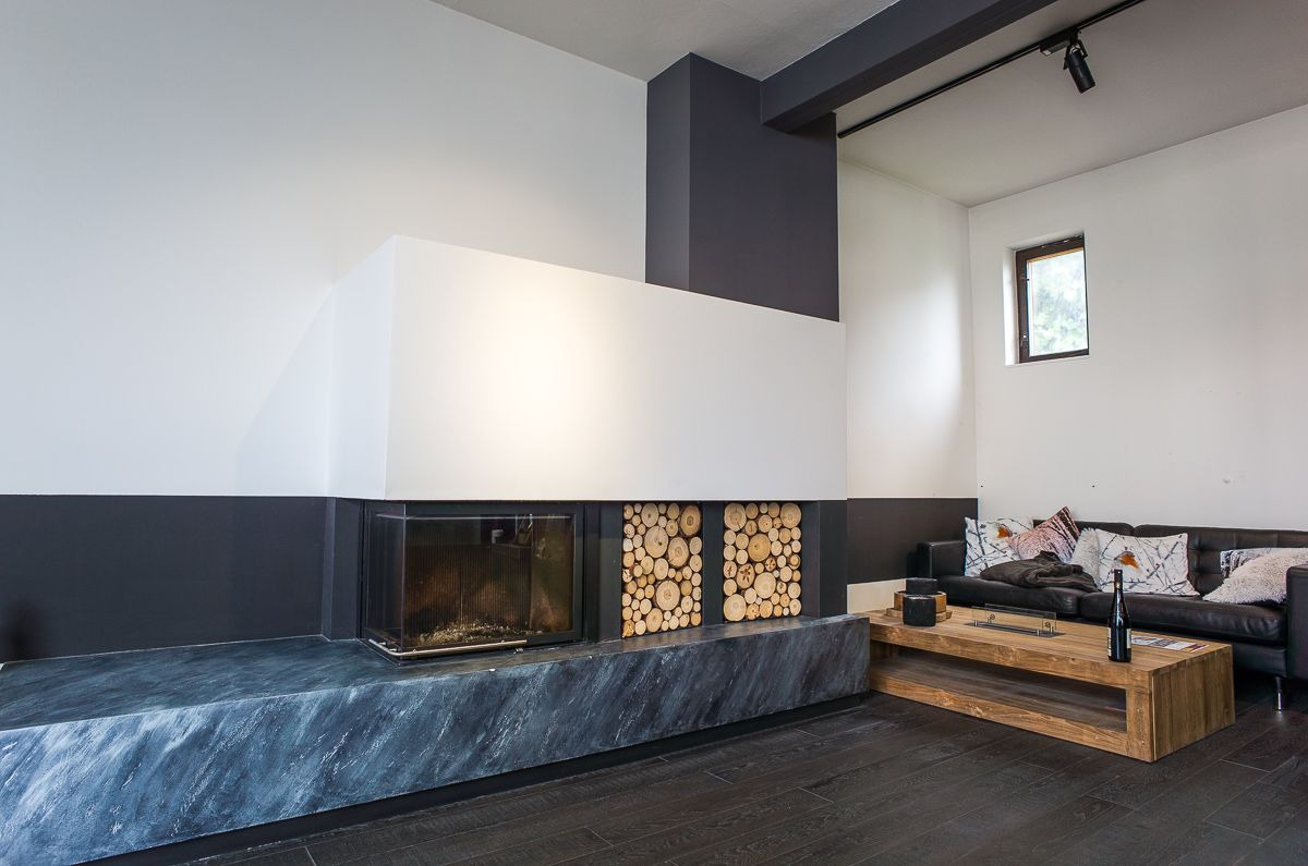 Jeden funkční akumulační krb zůstane v prostoru zachován, lze využít jako součást luxusního útulného zázemí, například k jednání s klienty. Podlahu pokrývá v přední části velkoformátová dlažba s metalickým efektem, na ní navazuje dřevěná parketová podlaha stejného odstínu. Částečně obložené zdi a strop stejným dekorem podlahy.
