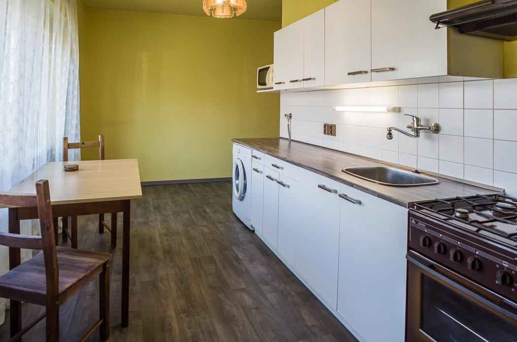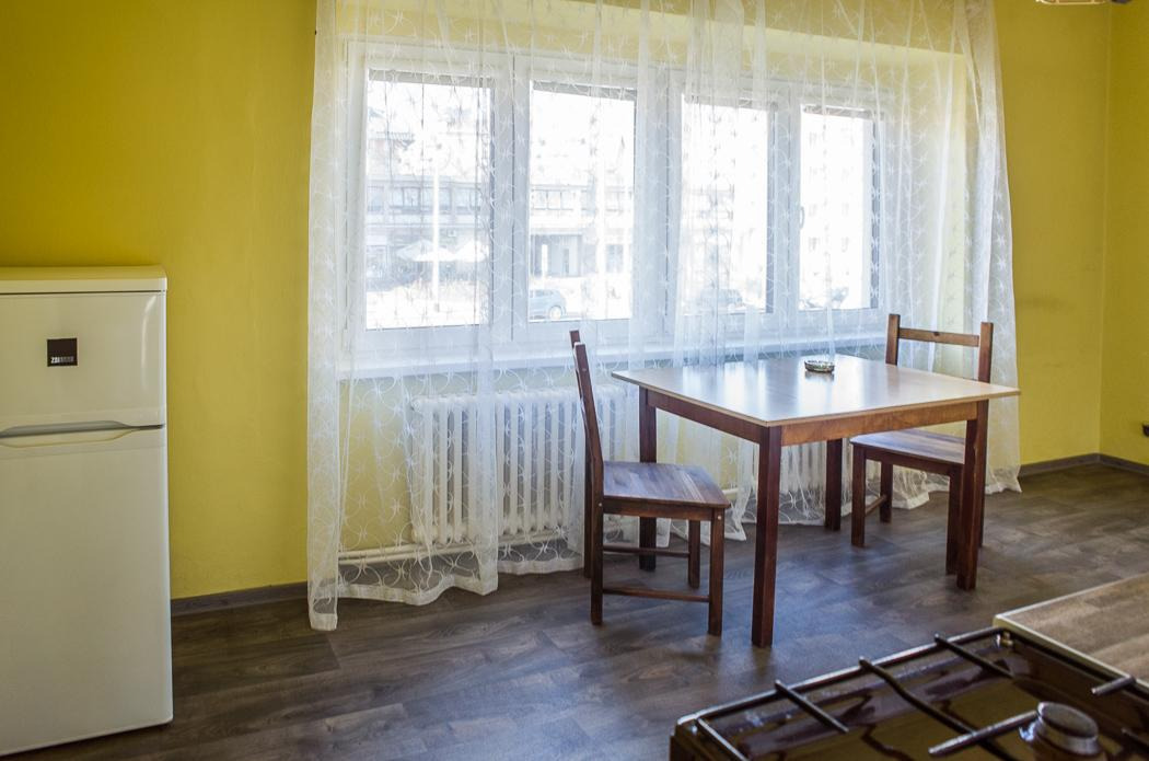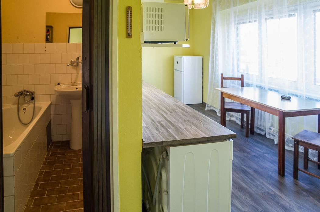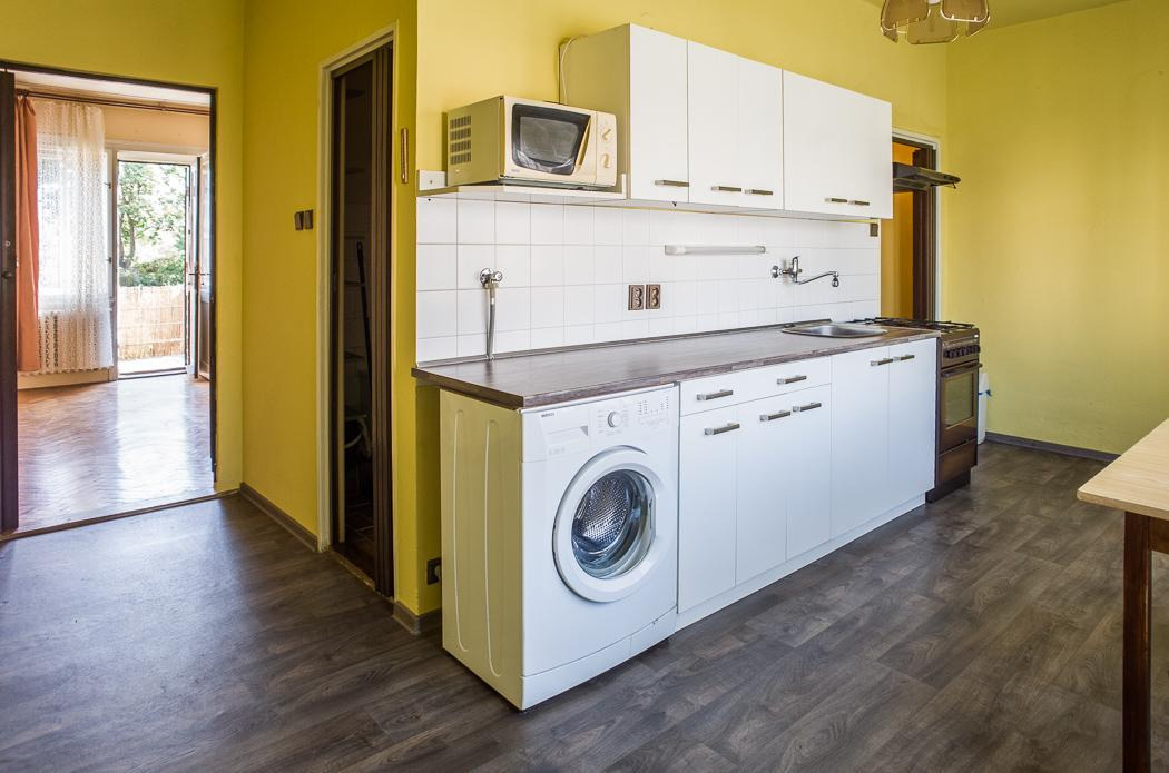 Dispozice sestává z malé předsíně, prostorné kuchyně vybavené kuchyňskou linkou s plynovým sporákem, zabudovanou pračkou a mikrovlnnou troubou. Součástí vybavení je i lednice s mrazákem, jídelní stůl a židle. Nová skříň.
