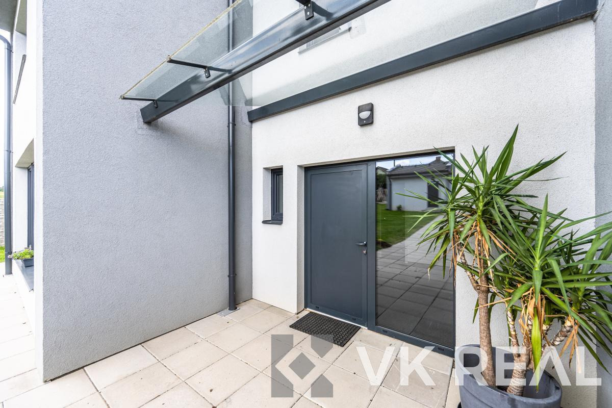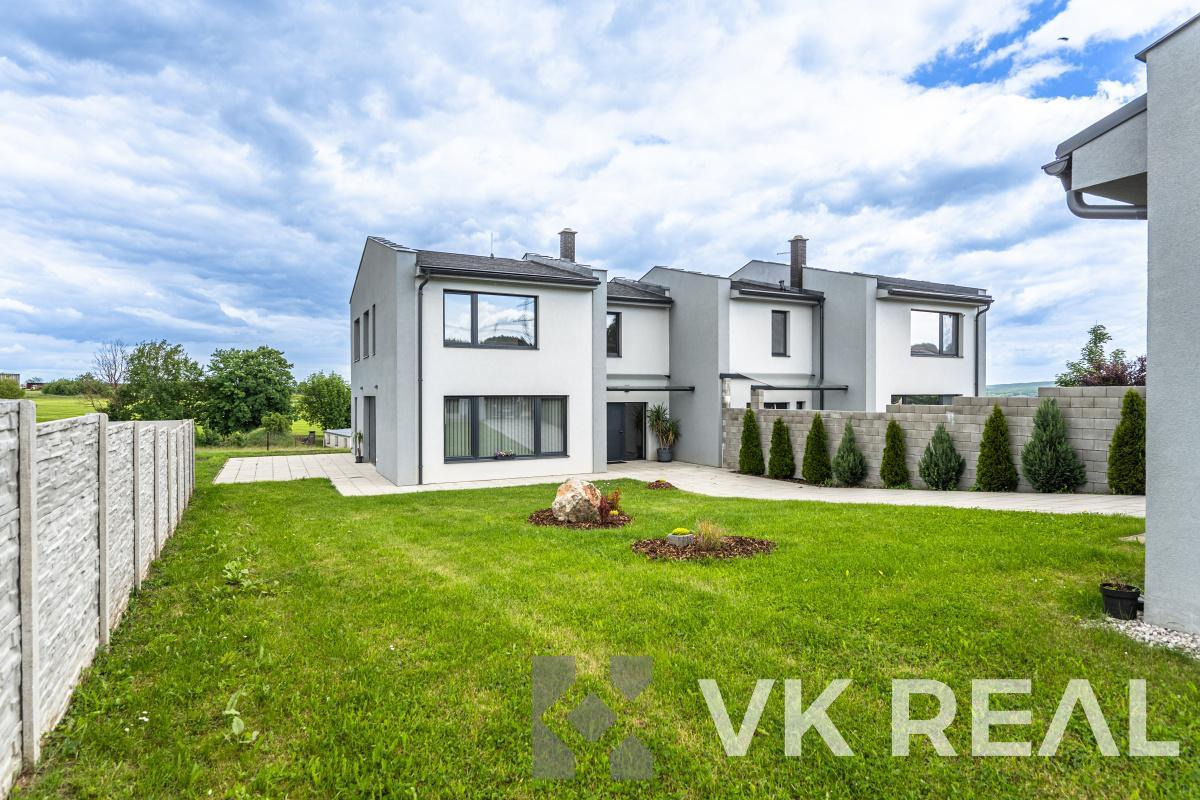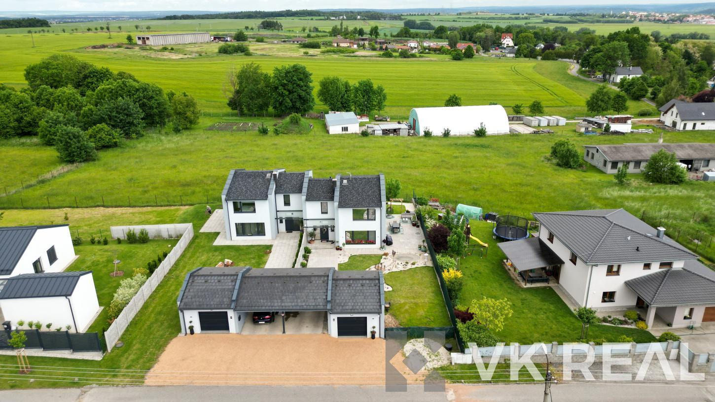 Dvoupodlažní dvojdům o dispozici 4+kk + příslušenství (pracovna, 2x šatna a technická místnost) nabízí komfortní zázemí pro rodinu i jednotlivce, kteří ocení prostor, klid a blízkost přírody.
