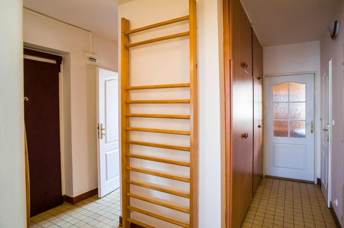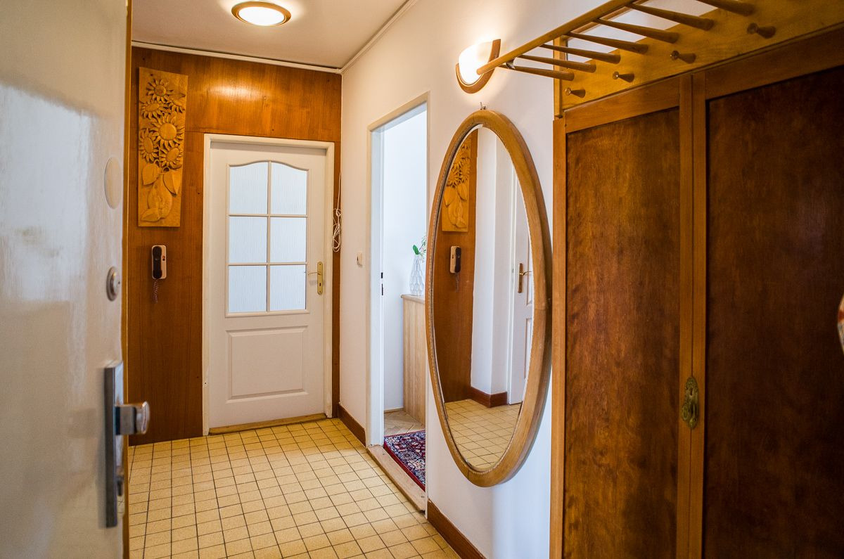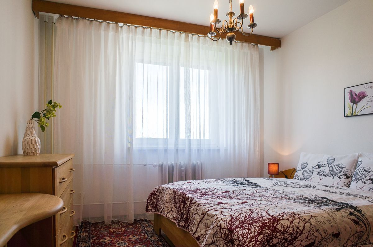 Světlý byt s velkými okny. Příjemný výhled díky vyššímu patru a daleko umístěnými domy z jedné strany a absenci domů z druhé.