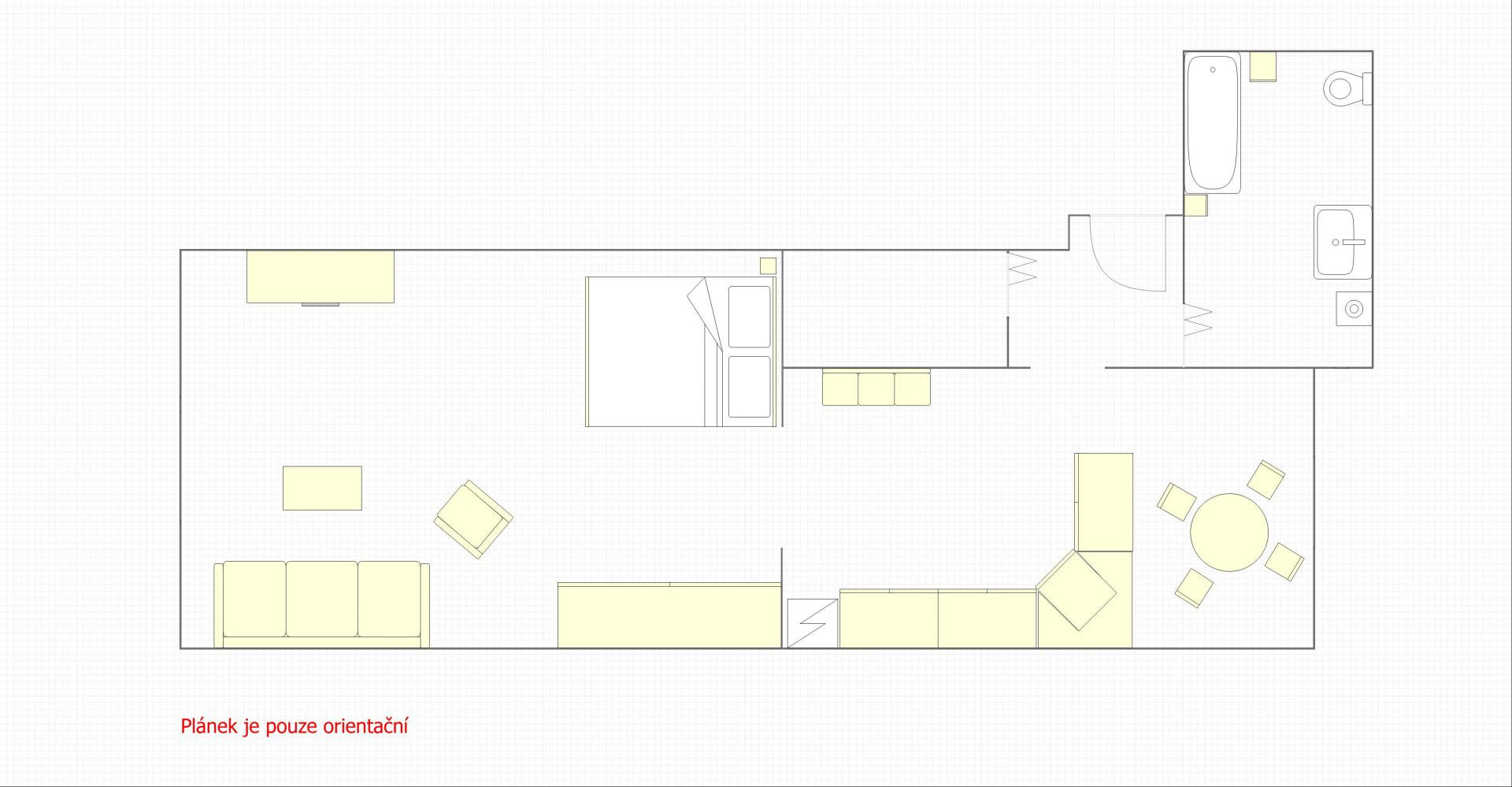 Dispozičně je byt rozdělen na vstupní předsíň, odkud se vchází do koupelny s vanou s WC, komory a kuchyně s jídelním koutem. Z kuchyně se dále prochází do obytného pokoje, který slouží jako obývací i spací část. Byt je ve velmi dobrém stavu, s plastovými okny orientovanými na jihovýchod a severozápad. Na podlahách je plovoucí podlaha a dlažba. Vytápění bytu je řešeno valstním plynovým kotlem a ohřev teplé vody zajišťuje elektrický bojler, oba spotřebiče jsou umístěny v koupelně