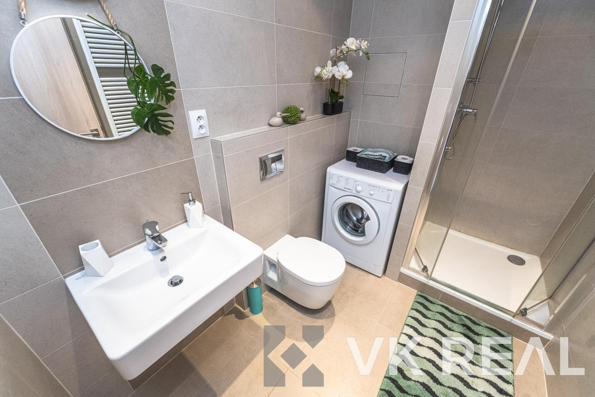 Dispozice bytu nabízí promyšlené využití prostoru - součástí je plně vybavená kuchyňská linka s vestavěnými spotřebiči (lednice, trouba, indukční deska, digestoř), v koupelně pračka a v předsíni praktická vestavěná skříň.