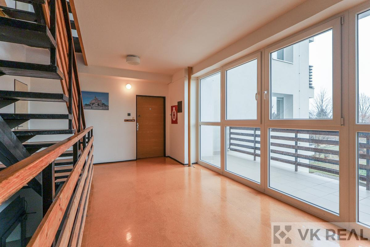 Vstup do bytu vede přes malou uzamykatelnou chodbičku sdílenou pouze třemi byty.
