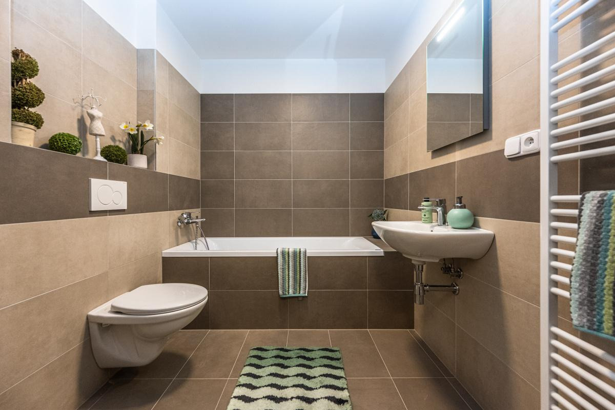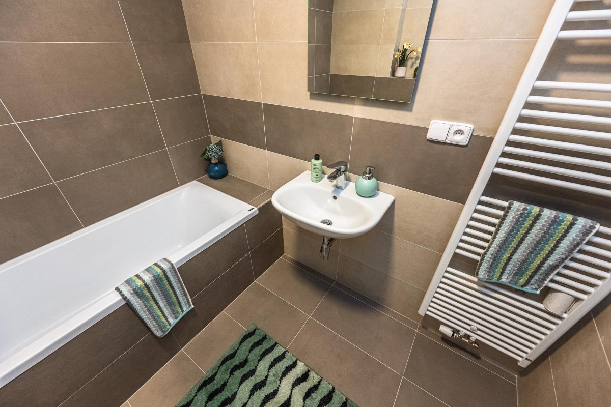 Prostorná koupelna (cca 4,6 m2) je vybavena vanou a WC. V předsíni je výklenek na vestavěnou skříň, v ložnici je místo pro další úložný prostor.