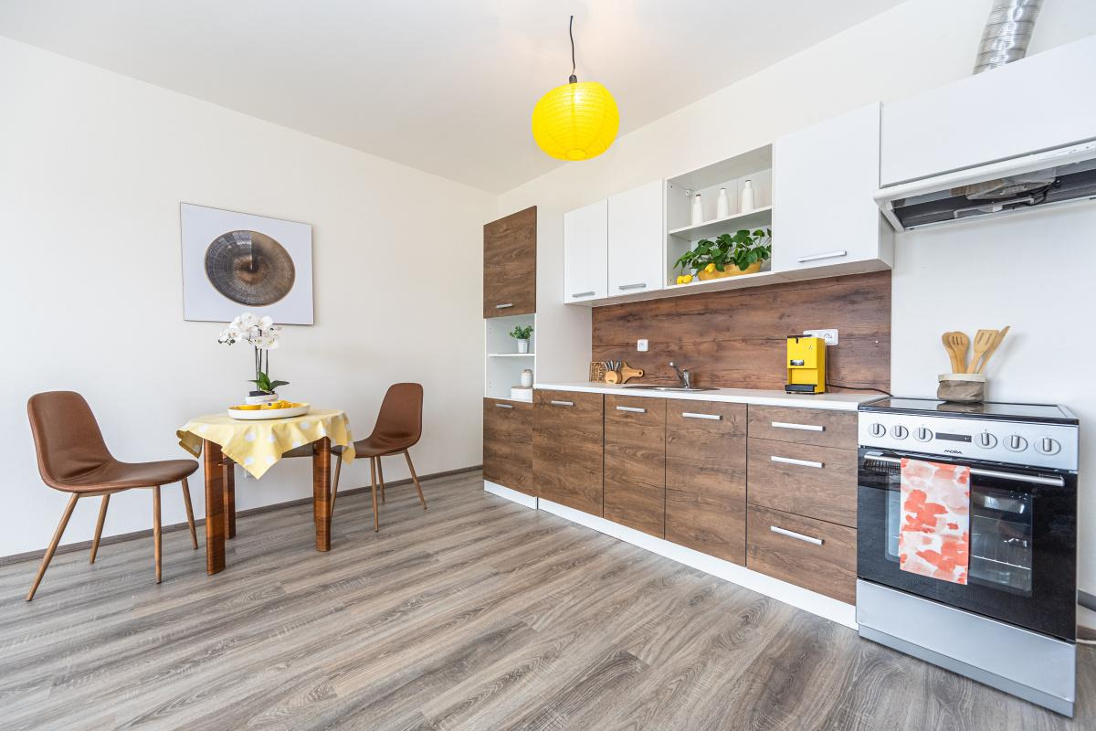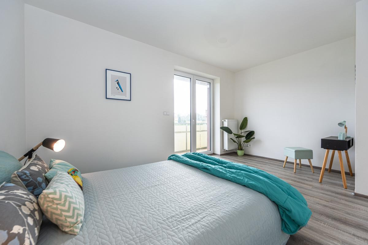 Byt je optimálně orientován všemi obytnými místnostmi na severovýchod, přičemž oba pokoje disponují svým vlastním vstupem na prostorný balkon, kde si můžete popřát ranní kávu za východu slunce.