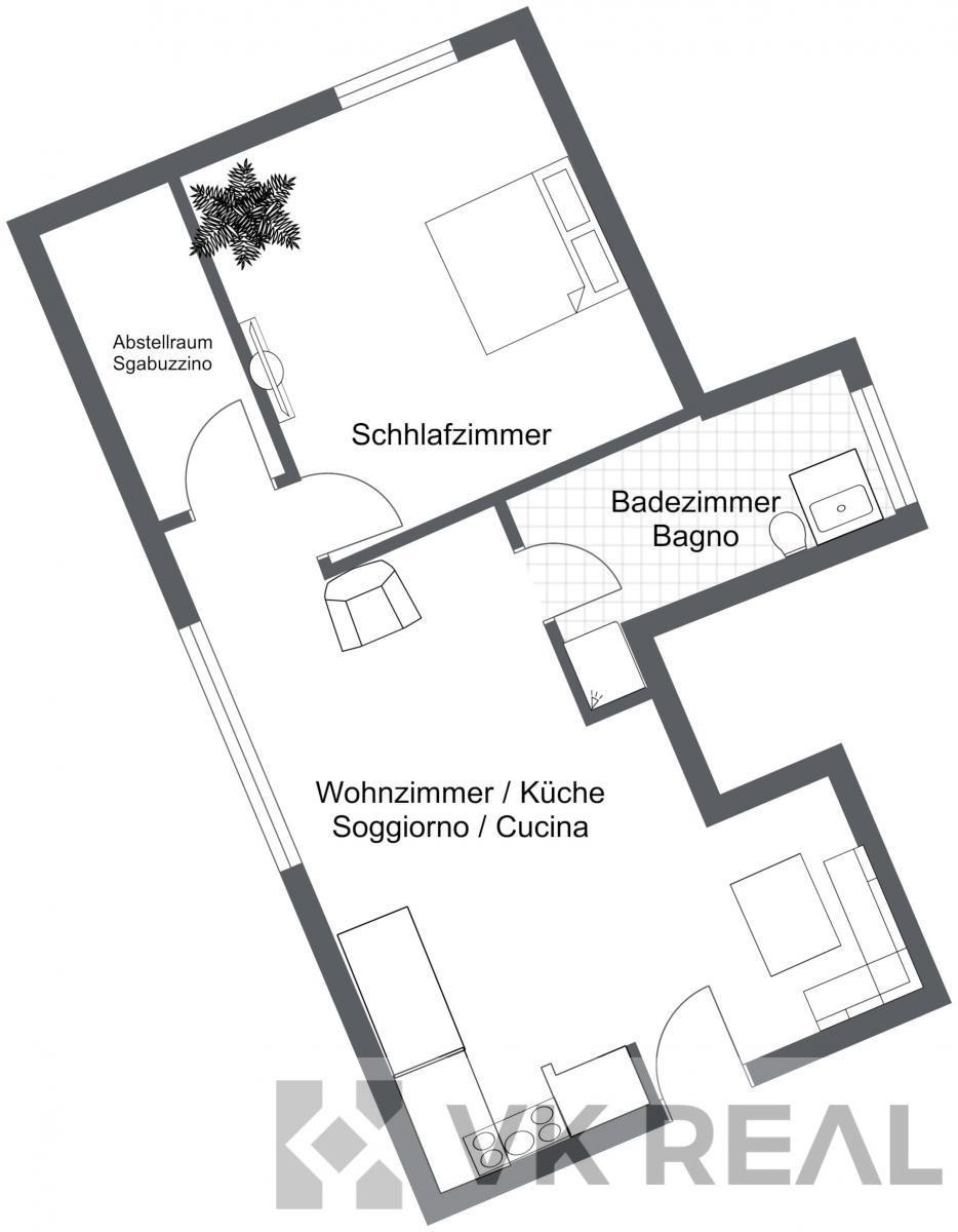 Byt je rozdělen na příjemný obývací prostor s kuchyňským koutem, prostornou ložnici, koupelnu s oknem a sprchovým koutem a praktickou komoru.