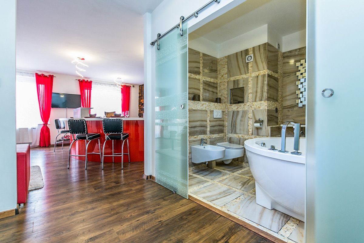 Dispozice sestává z předsíně, ze které se vchází do obývacího prostoru propojeného s kuchyní. Z obývacího pokoje vedou skleněné dveře do ložnice. Přístup na lodžii je jak z obývacího pokoje, tak z ložnice. Skleněné posuvné dveře do koupelny i šatny.