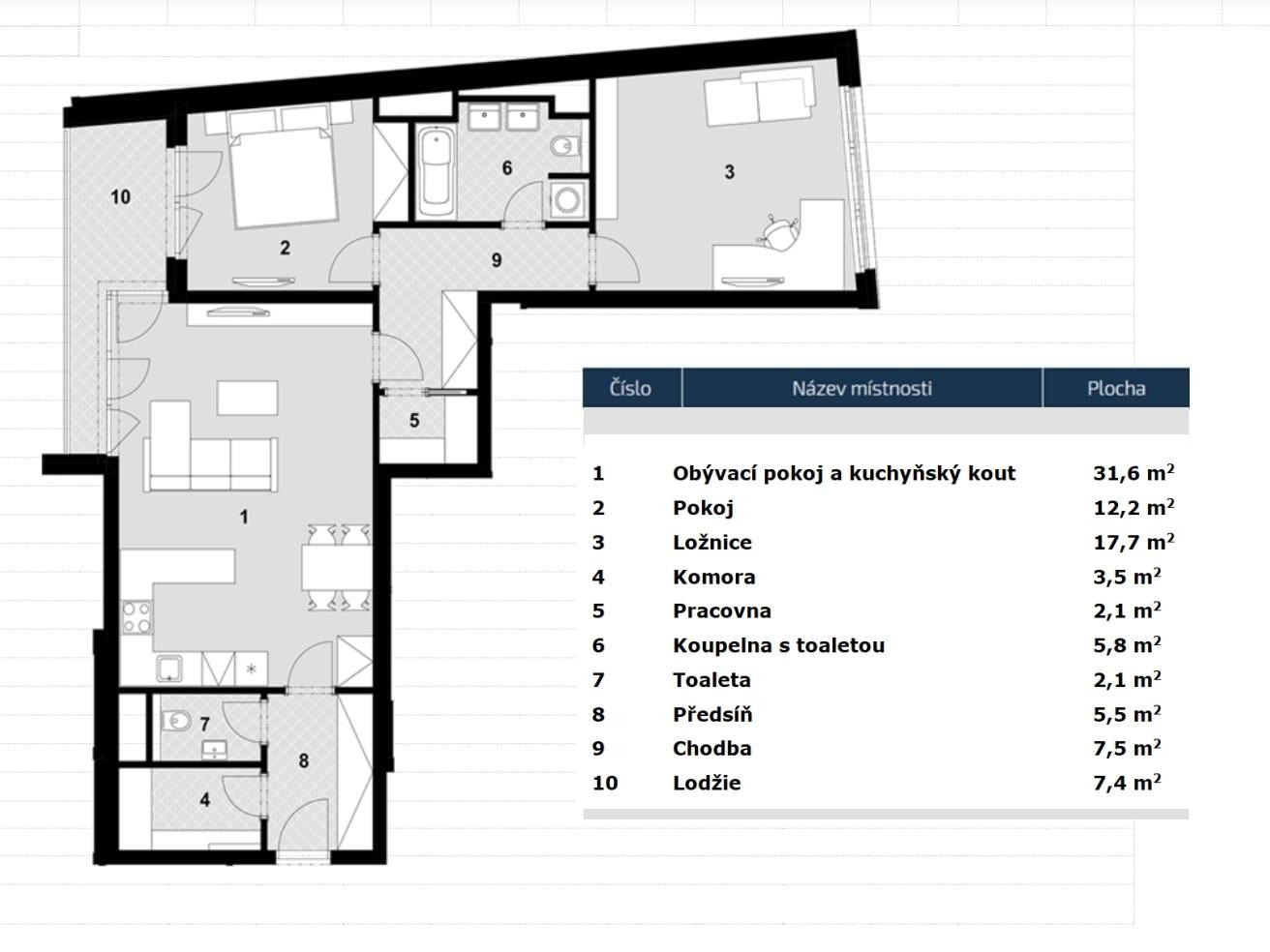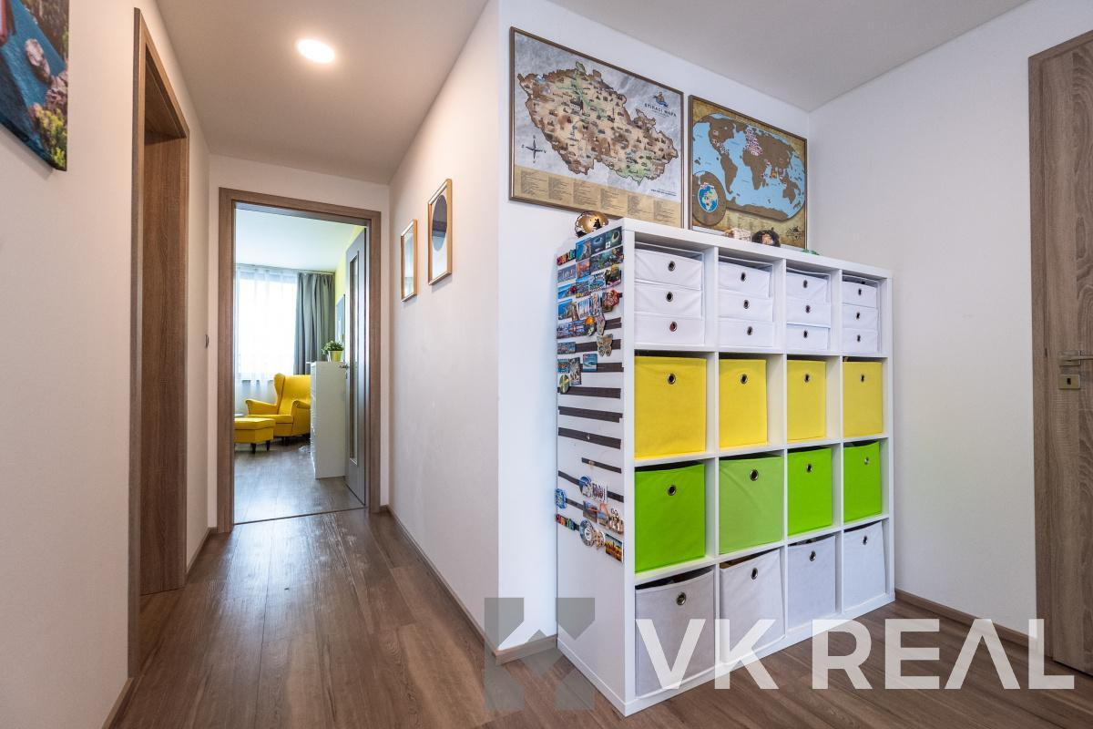 Jeho praktická dispozice zahrnuje vstupní předsíň, šatnu, denní WC, prostorný obývací pokoj s kuchyní, dětský pokoj a ložnici, koupelnu s vanou a WC, pracovnu a lodžii. Lodžie je přístupná z obývacího a dětského pokoje a je orientována jihozápadním směrem do klidného vnitrobloku plného zeleně.