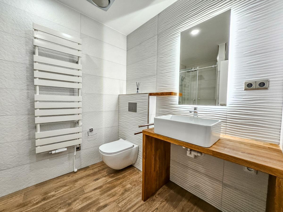 Vytápění bytu je zajištěno vlastním plynovým kondenzačním kotlem a kombinací radiátorů (v místnostech s koberci) a podlahového topení v ostatních místnostech.