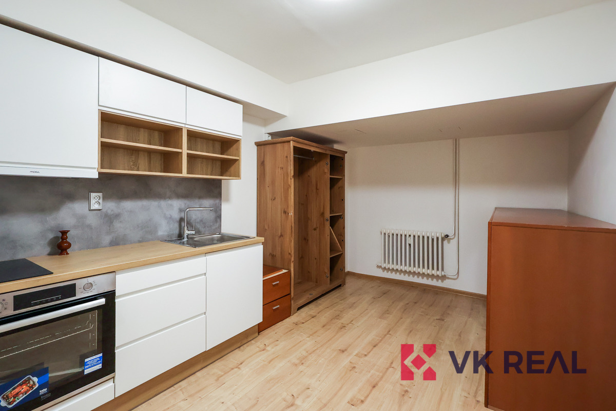 Prostor disponuje jednou hlavní místností s kuchyňskou linkou (indukční dvouvařič, elektrická trouba, odsavač s recirkulací, vyobrazené skříně nejsou součástí prodeje), dále je zde vstup do koupelny se sprchovým koutem a WC. Na podlaze je položená plovoucí podlaha, koupelna a WC dlažba. Vše je nové, v podstatě nepoužité.