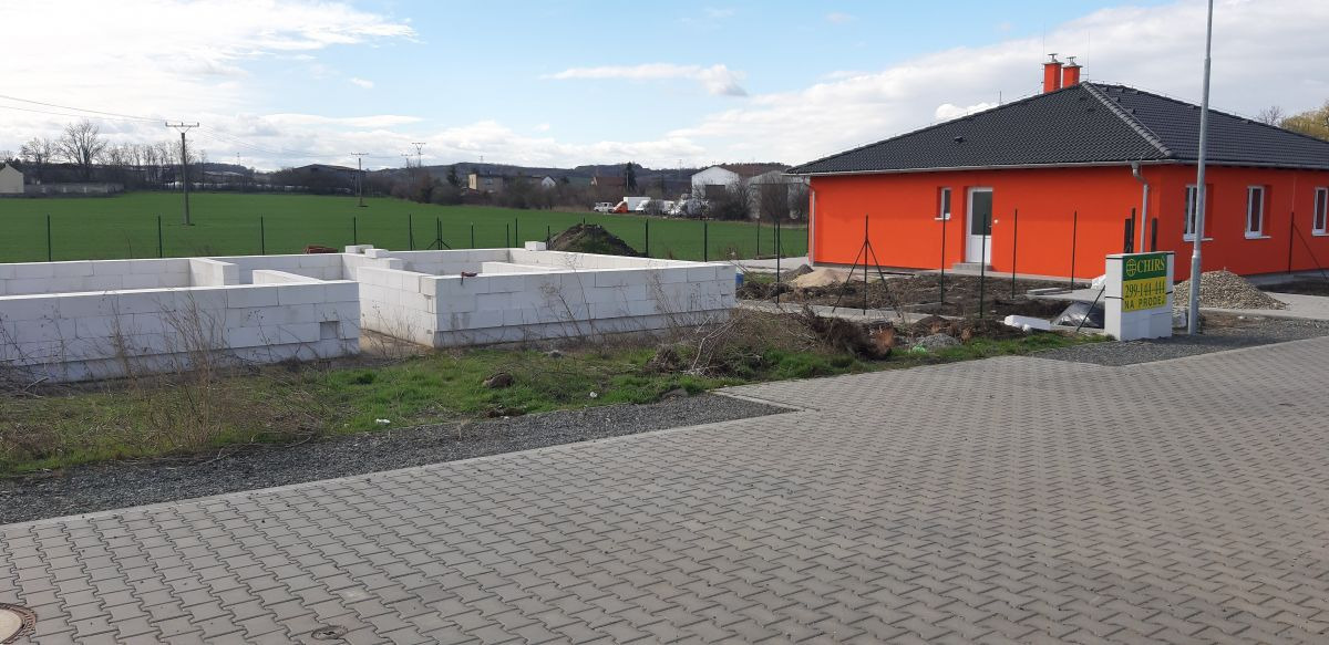 Hotová je základová deska včetně izolací a cca do 1 metru výšky vystavěné venkovní stěny.