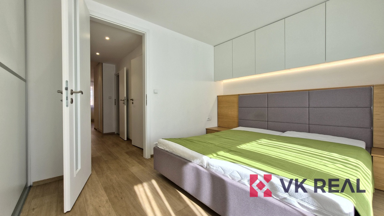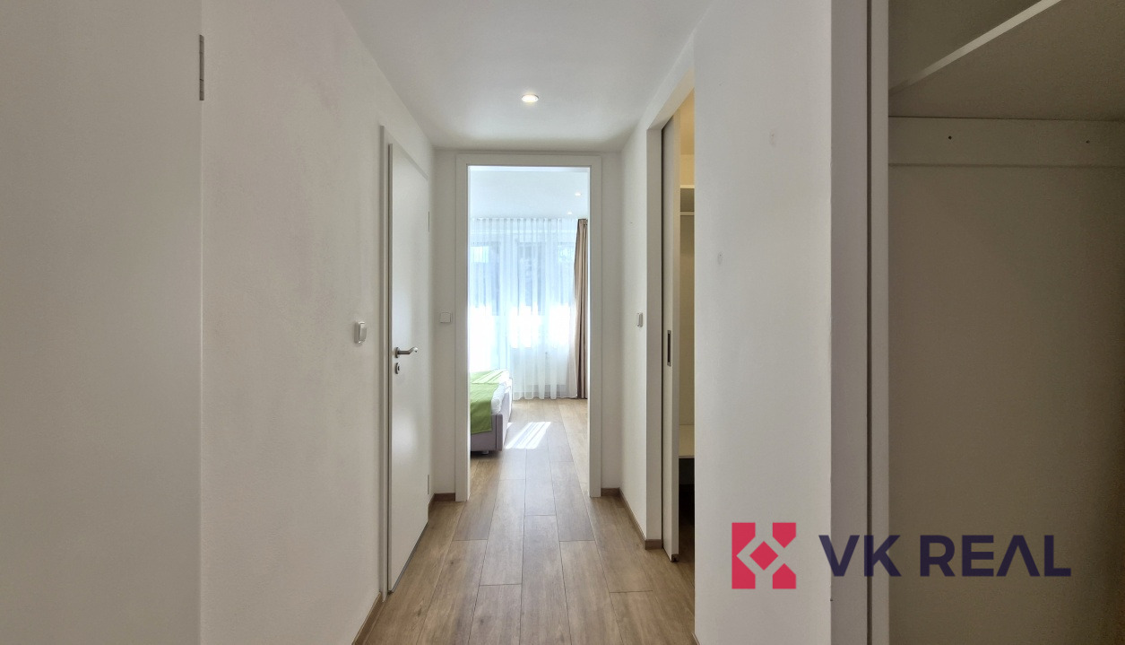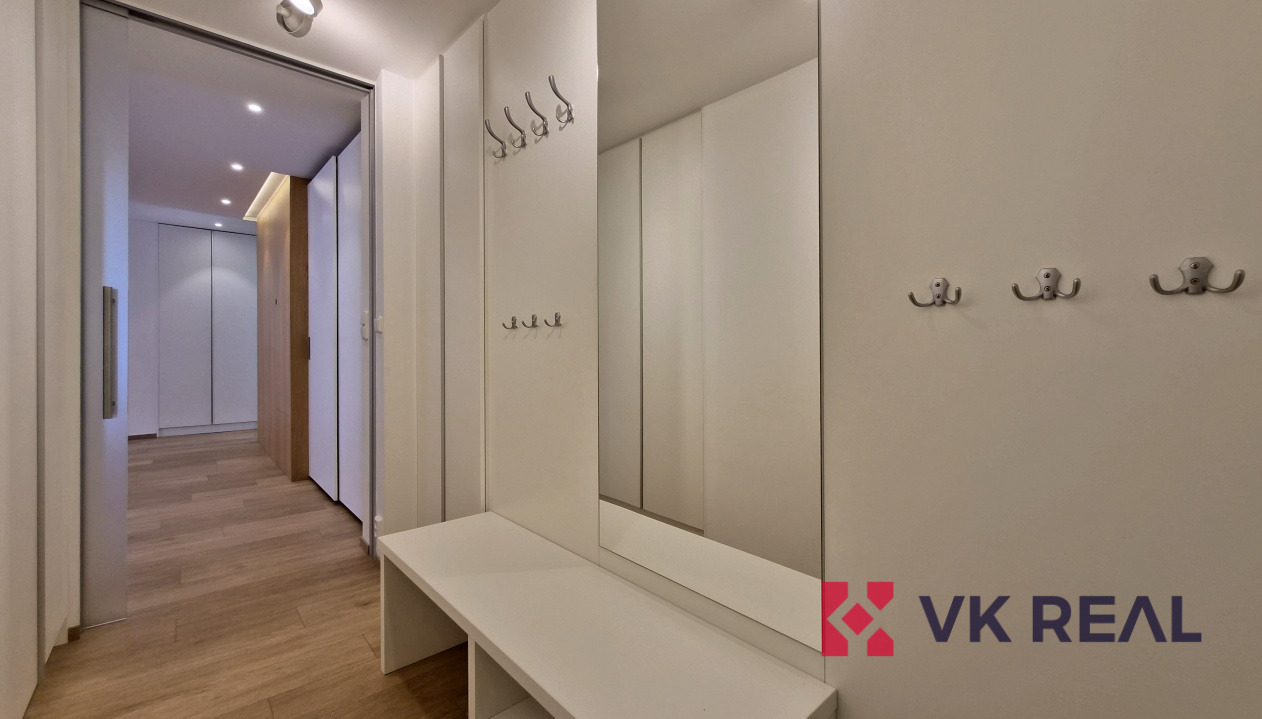 Interiér bytu je doplněn nábytkem vyrobeným na míru, který zahrnuje vestavěné skříně, postele a další praktické úložné prvky. Díky tomu byt nabízí mimořádně velkorysé úložné možnosti, které ocení každá domácnost.